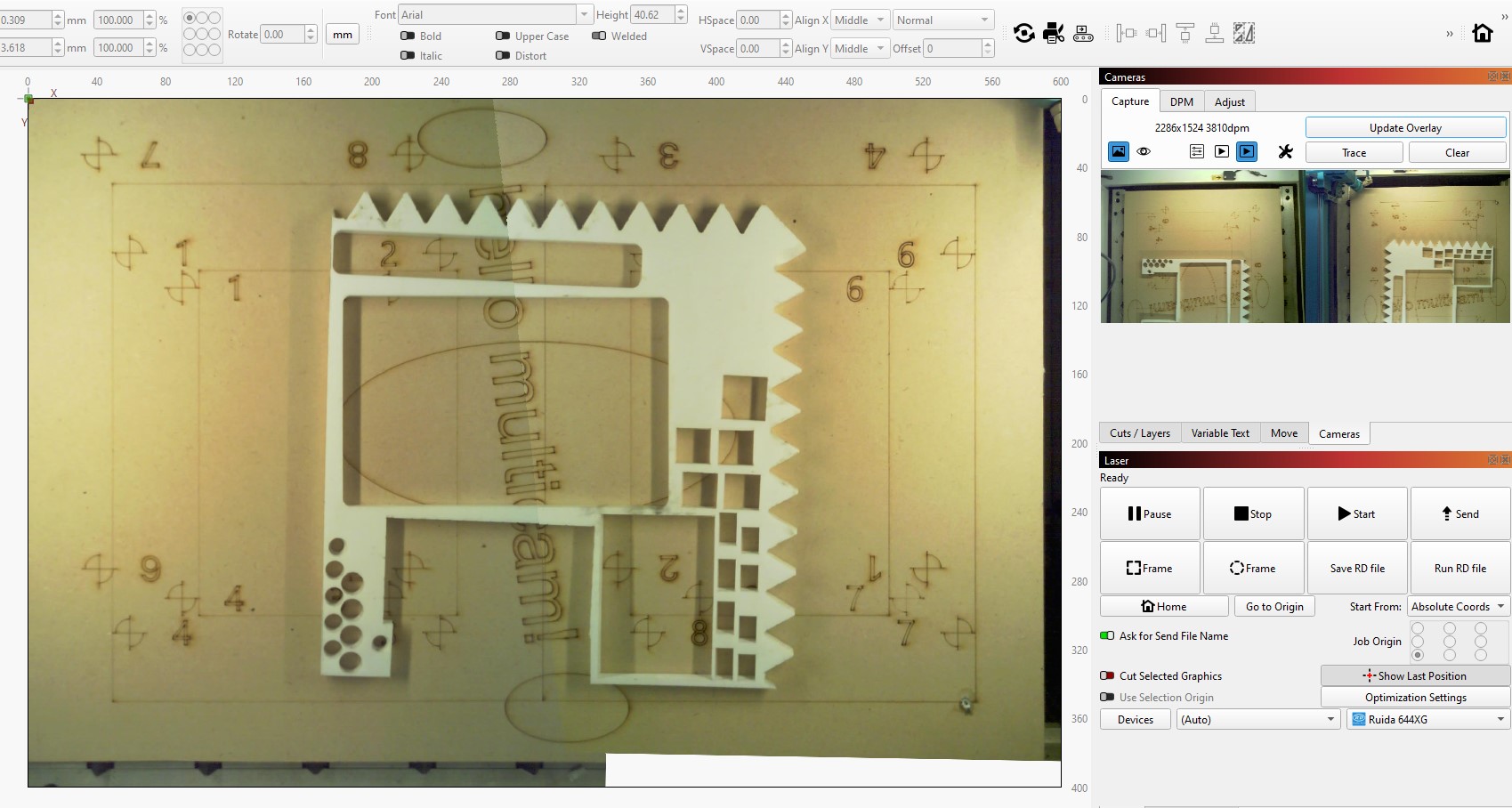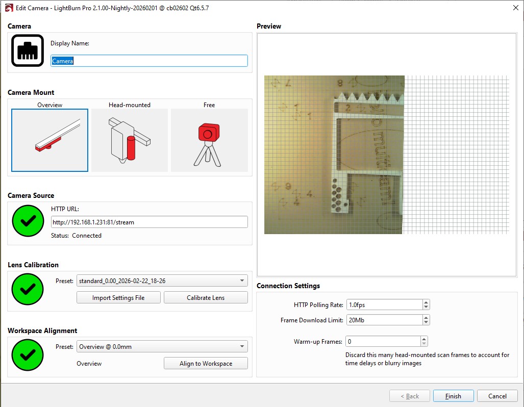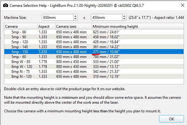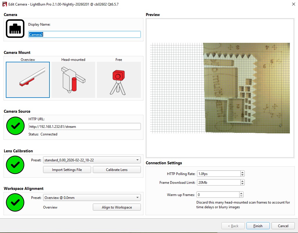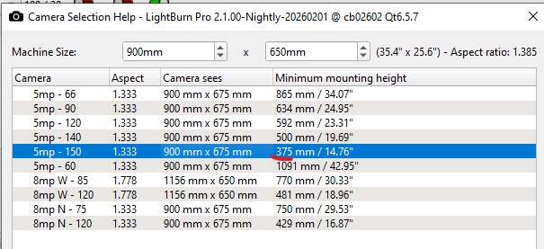 The camera we use with Lightburn is a completely different story and we barely use it. The main problem is that the our BRM does not allow to jog the machine with the lid open. So our users (students / non-experienced laser users) constantly close / open the lid to make a new overlay image when the laser head is in the way. Yes, we can set it so that the laser head moves out of the way after each job, but that also has its downsides. Also the alignment was always a problem/unreliable. So off course I was excited to see updates coming to this wizard since we throw away sooo much material because the camera is not intuitive in our case.