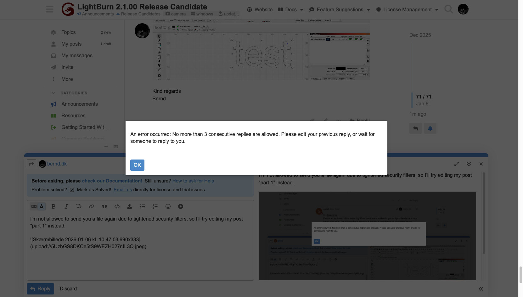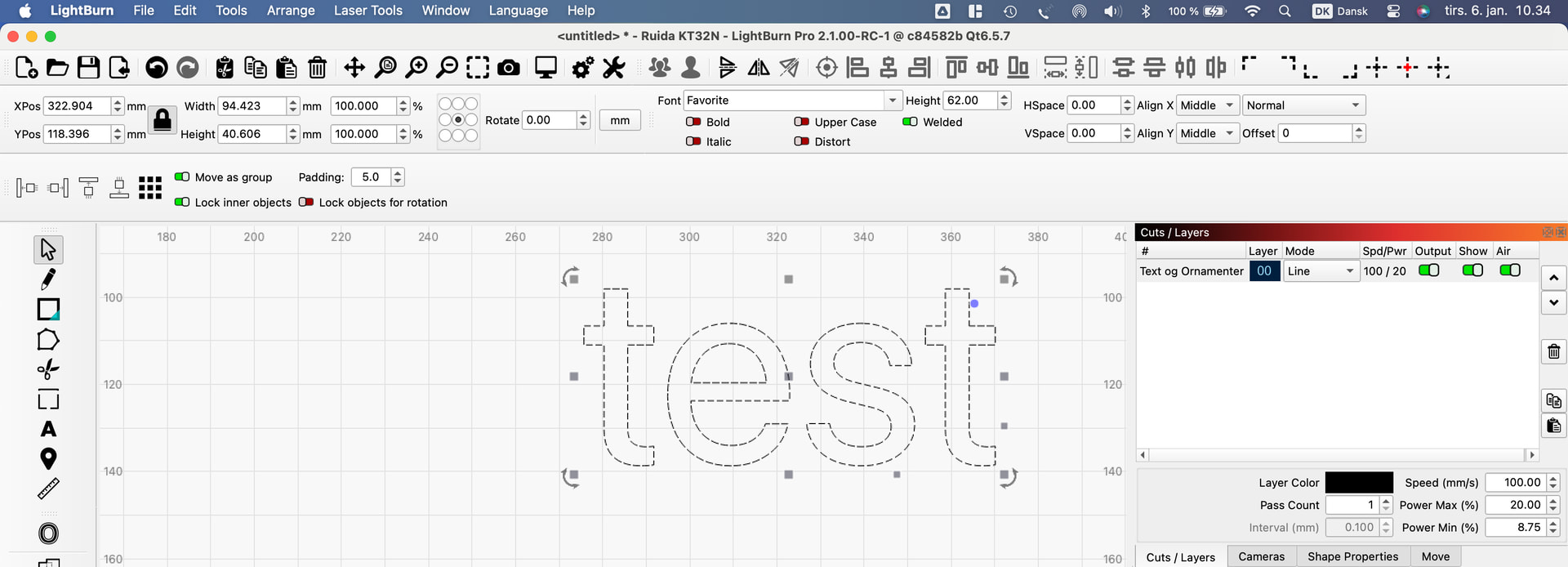 Both MacBooks are fairly similar in setup of LB, MBP1 I have always used as a construction and design computer for LightBurn while I used a Linux PC for the actual operation of the laser machine. The LB files are either sent over LAN or e-mail to each other. Since Linux support has stopped, I have started to prepare an MBP (no.2) to take over my Linux computer’s task of controlling the laser. Communication between all 3 machines takes place over LAN/Wifi, this of course also applies to my laser (standard OMT with Ruida clone)