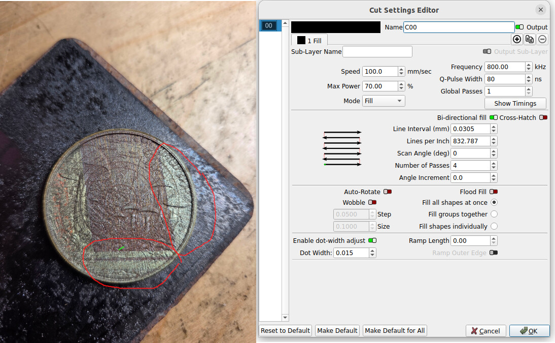 This is a pretty nasty brass coin from Amazon that I use about anything I can think of. It was pretty abused. The areas circled use these settings.