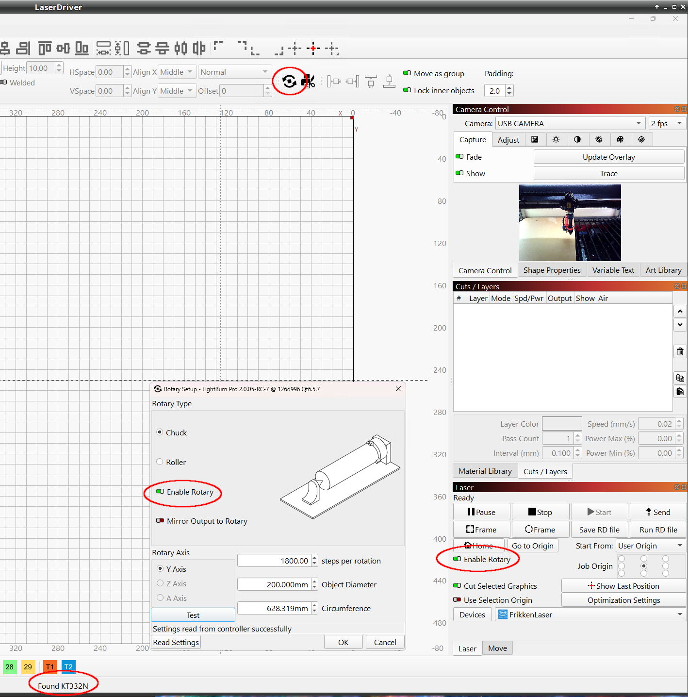 More pondering is in order, but I have the uneasy feeling something is wrong with LightBurn’s KT332N handling, because the Test button moves the X axis, not the Y axis.