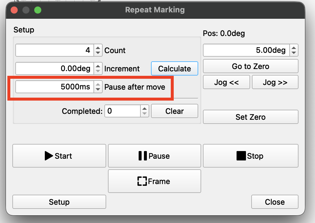 Yup, that’s a bit like EzCad’s rotary mark feature, it’s for when you want to mark a complete single shape “flat”, so good when you have small repeating decorative elements around a cylinder. Could definitely be hacked a bit to use for adding a delay.