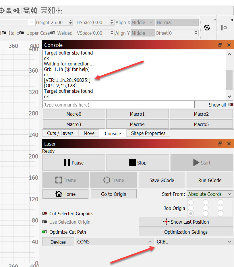 After the communication begins you can capture the welcome or wake-up message in the Console window in LightBurn and confirm which version of LightBurn you have on your controller. Knowing that it’s 1.1f or 1.1h (or any other version) is useful. The string of letters next to OPT: also lets us know which firmware options were selected when it was built.