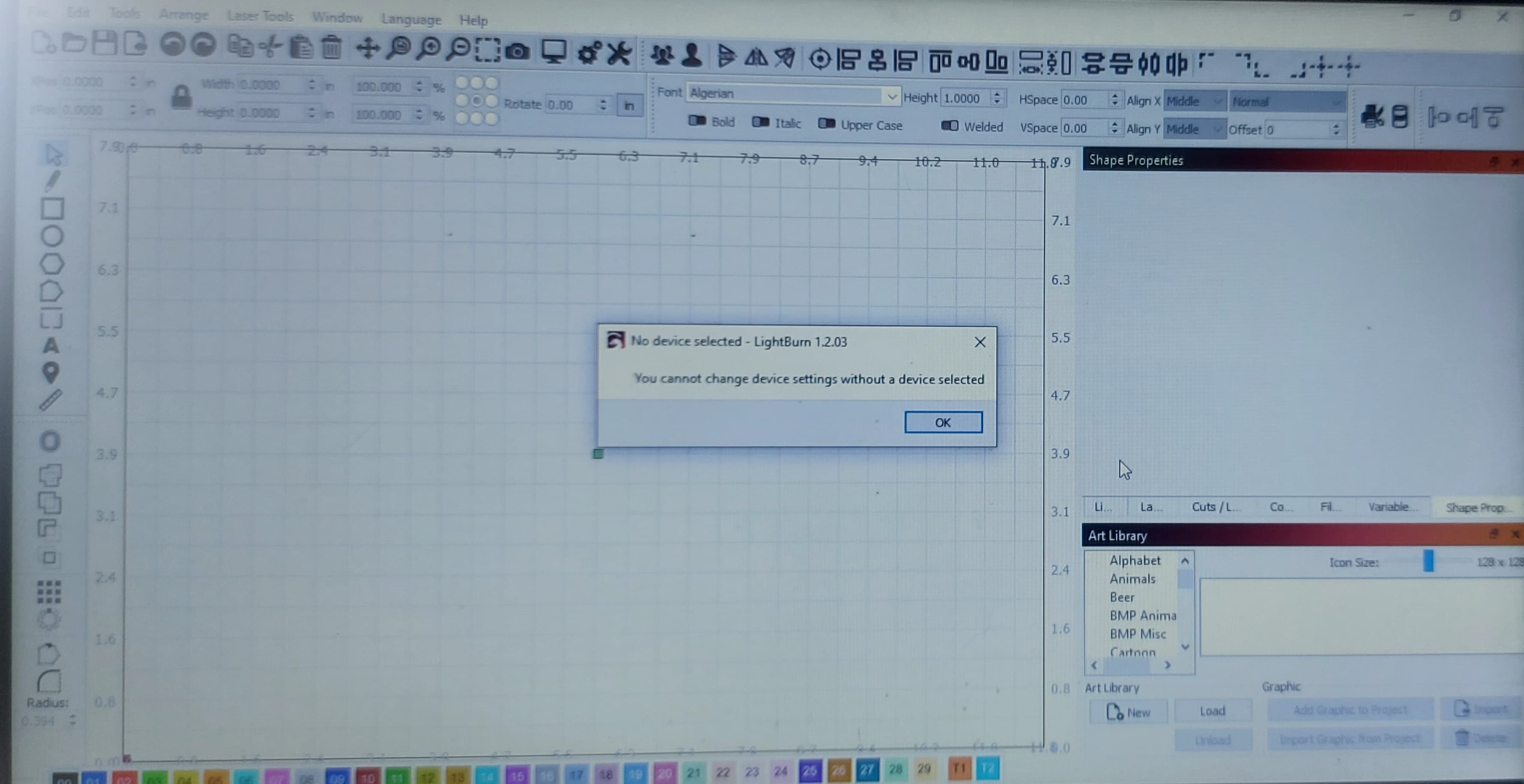 I have LightBurn installed on my laptop but I am trying to make the size of the workspace match the size of my laser workspace but just can’t seem to get it. When I click on the device settings, I get a message saying, not device selected. I have not connected this to the laser as I have 2 other computers that I want to design stuff on and i can’t connect them to the laser either because of where they are located. Just want the space on my software to match the laser. I contacted a lot of forums and one person said it could be a flaw but I’m not sure.