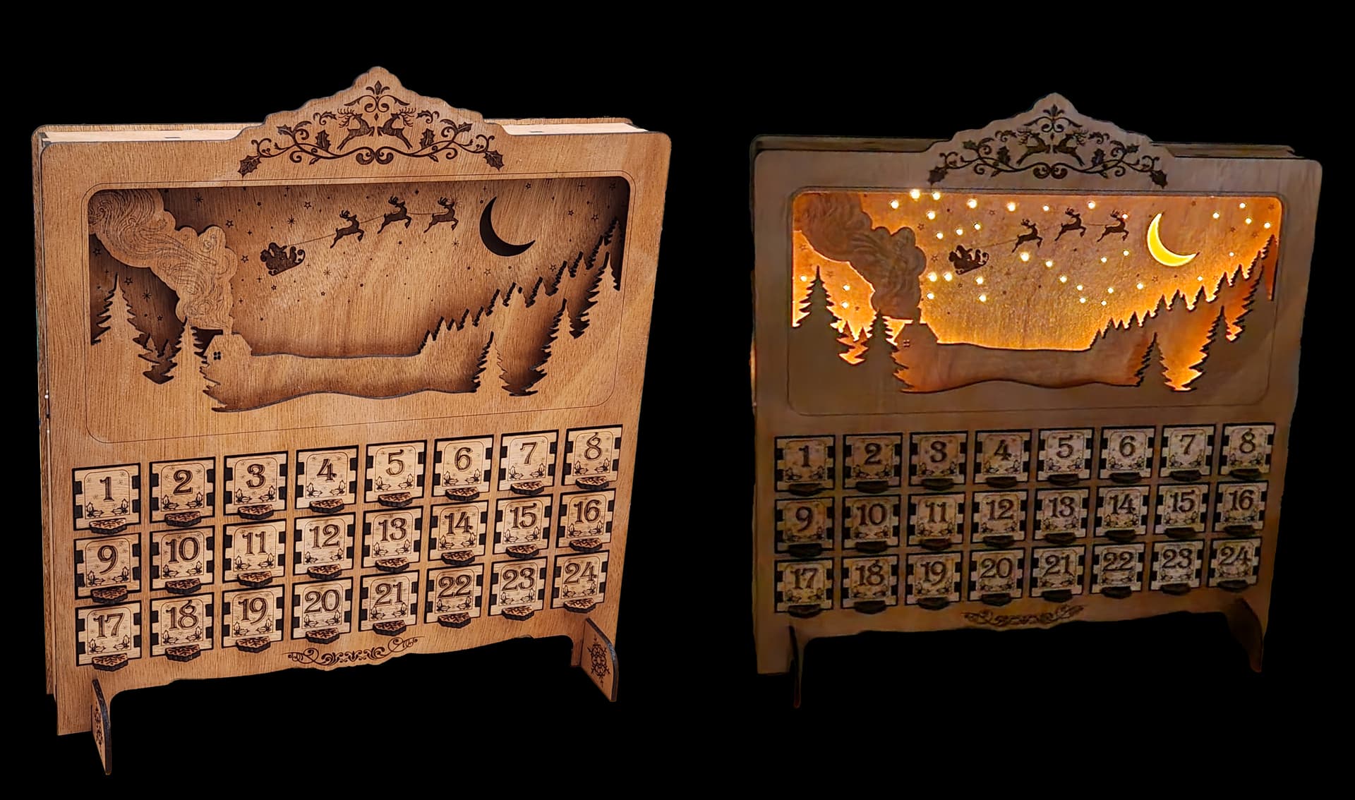 Custom designed advent calendar done in 4mm ply. Lighting done via 3 tea lights & optical fiber.