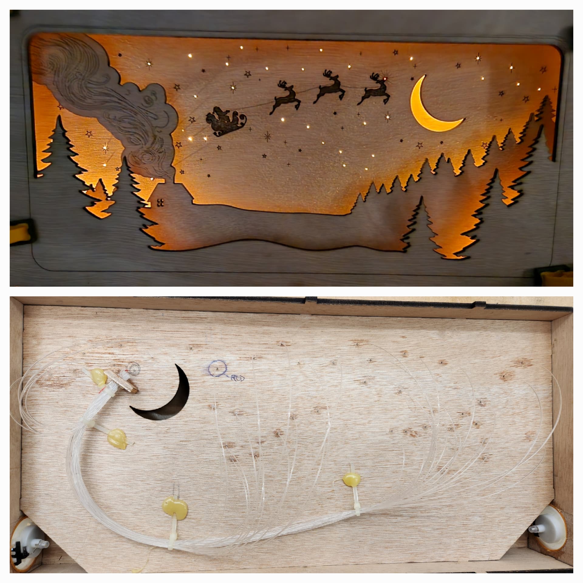Stars were holes lasered into the 4mm ply that matched some optical fiber I purchased. Fiber was super-glued (CA glue) into each hole, then the ends were combined and a tea light was placed to power the fibers.