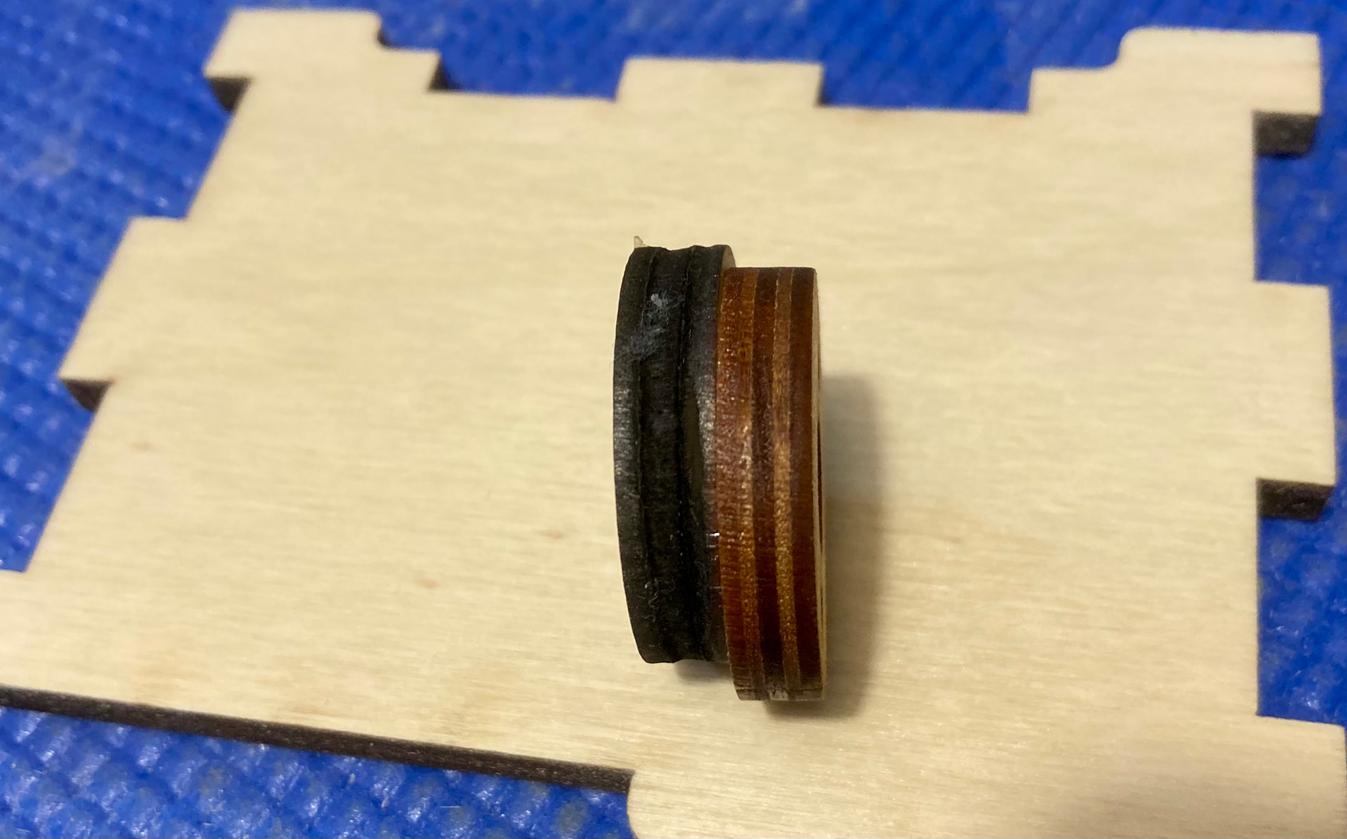 Up to now I’ve paid someone local to cut all the pieces I need but am now ready to get my own machine. My issue is that when I’ve done test cuts on a second hand machine using my material I’ve not been able to replicate the clean-ness of the cut. There is a shiny brown residue on the top surface around the cut lines. It can be mostly wiped off but as I’m cutting 100s of tiny pieces at a time I couldn’t mask / clean each one. Bottom surface is perfect.