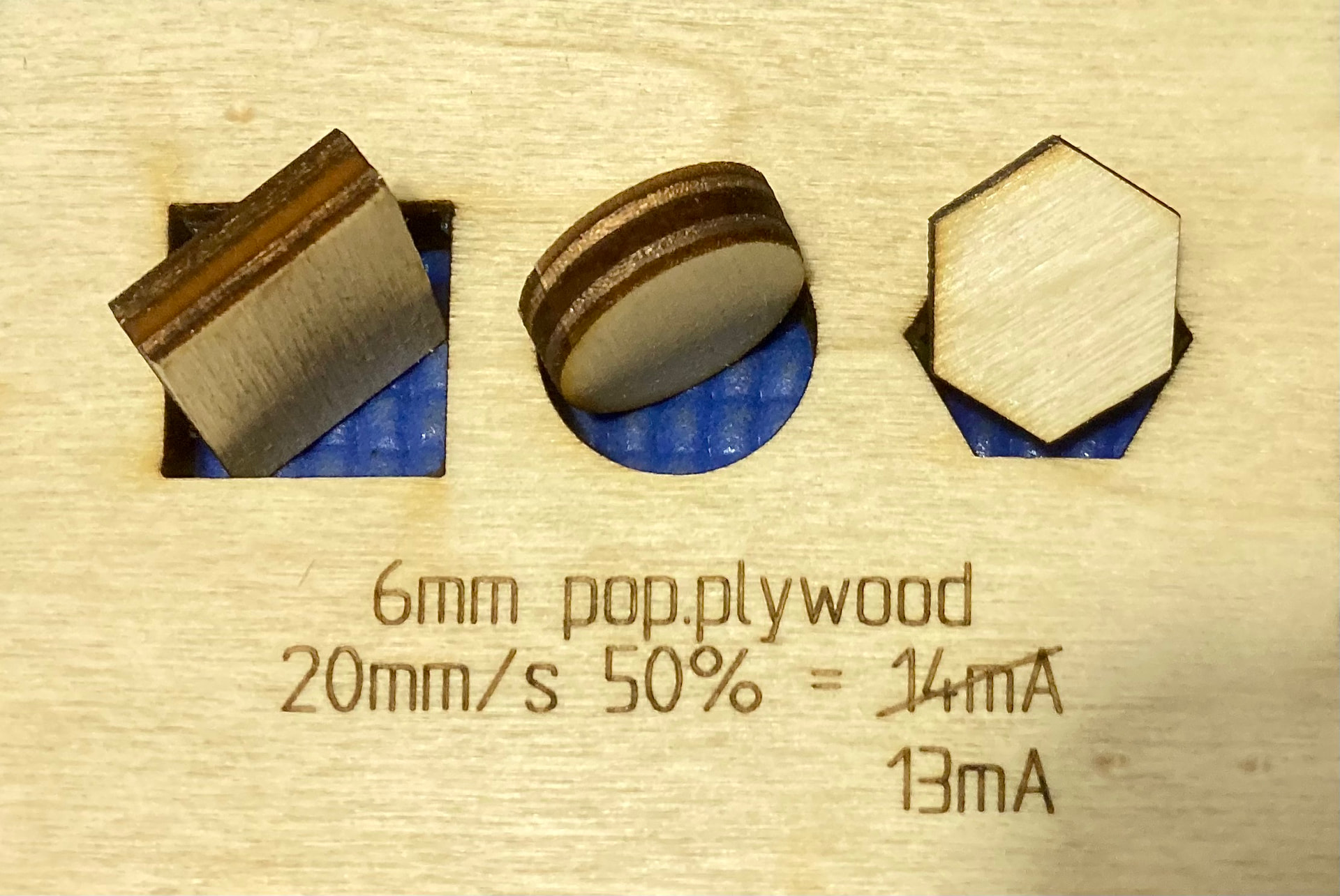 I cut 6mm poplar plywood with 20 mm/s and 50% power which corresponds to 13mA. It could be done faster but for me this is reasonably optimal. The color is a bit misleading, the cut edge is actually nice and bright.