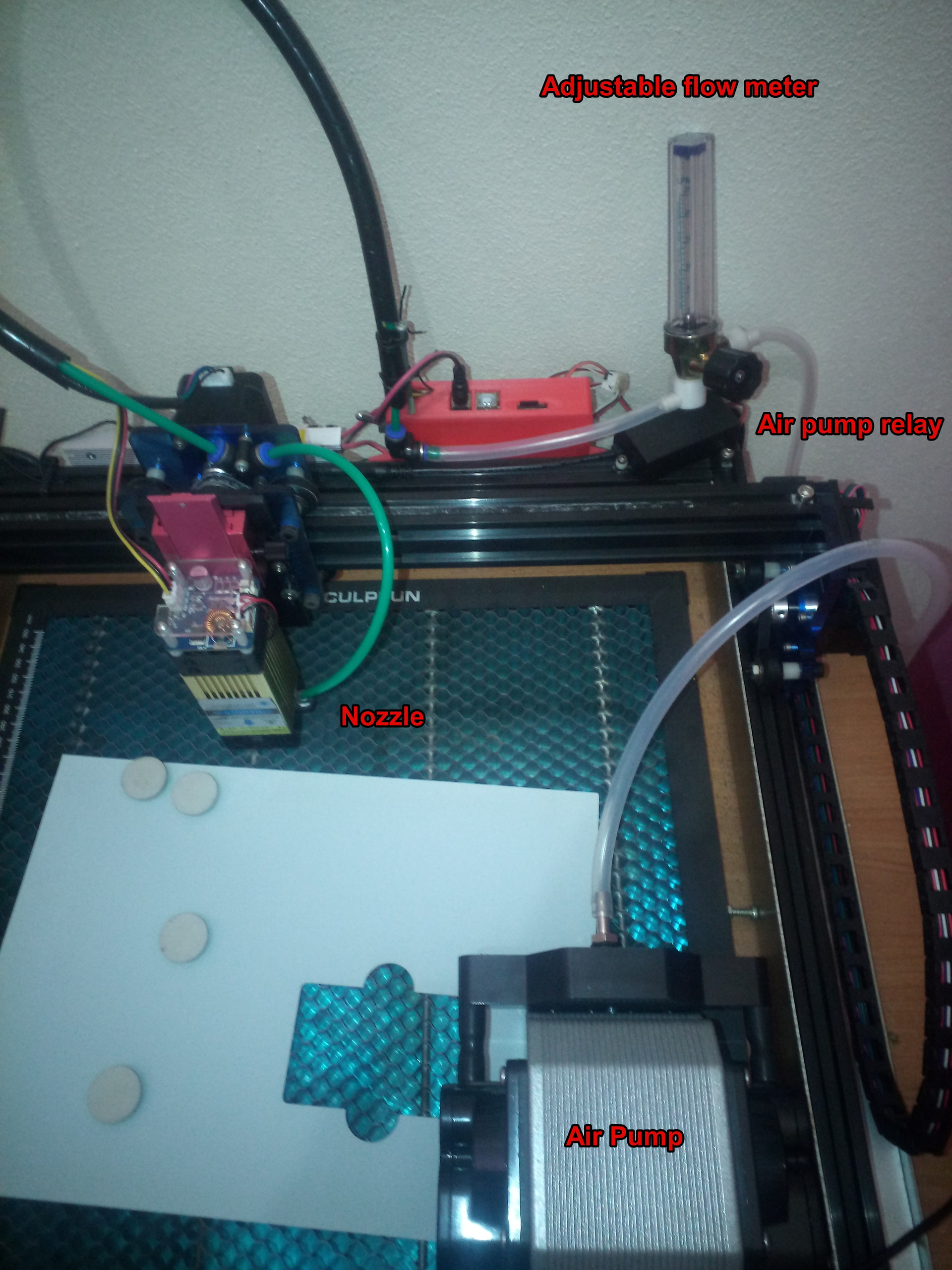 Air flow around 12 l/m from the OEM air pump seems adequate for my simple needs, with a crude test showing skinny tubing & valves limit the flow even at higher pressure. It’s apparently possible to stuff enough air inside the laser head to fracture the focus lens, so don’t get carried away with compressor pressure.