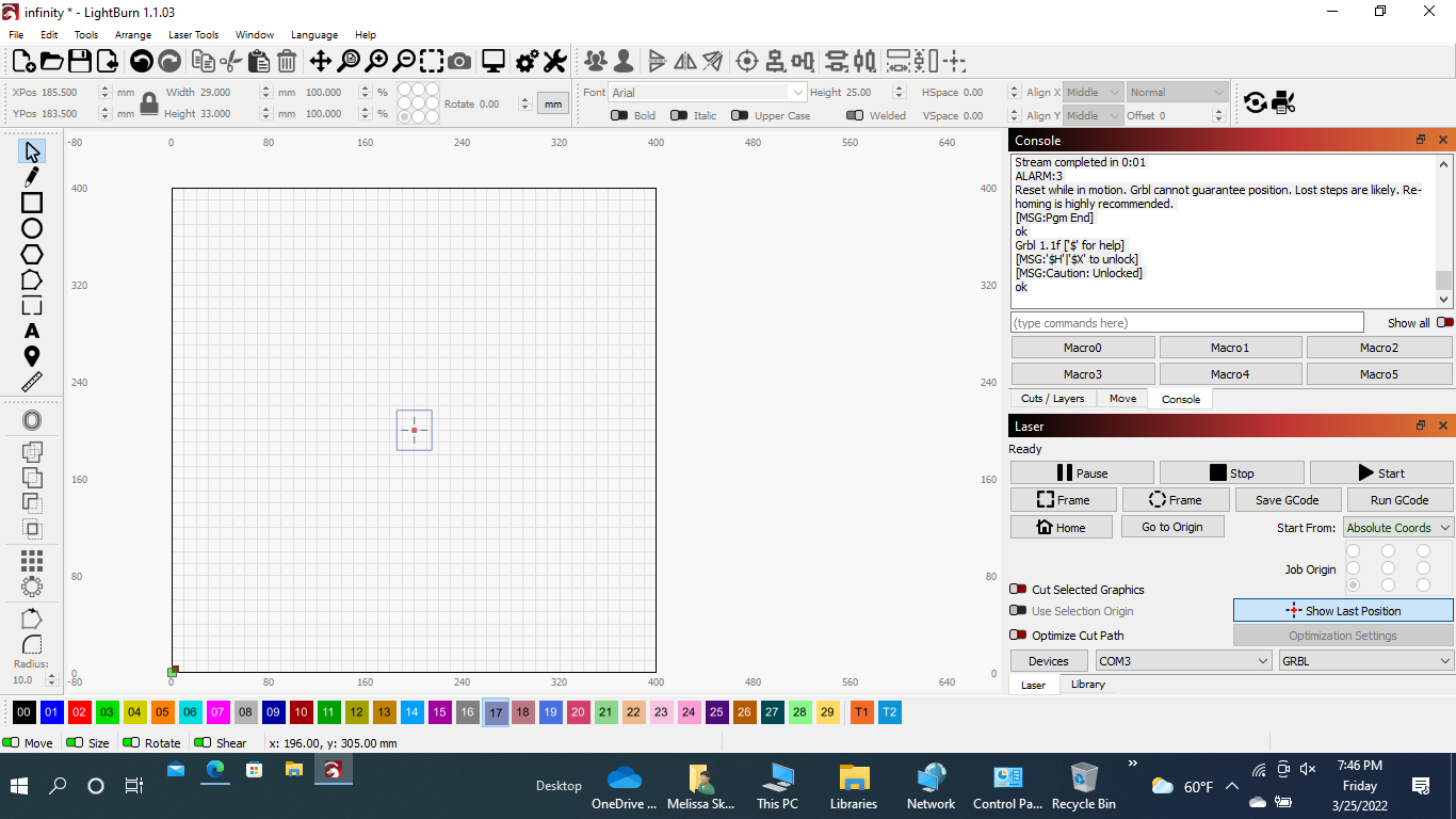 When I power on the laser is at X0 Y0. If I frame a project the laser goes to starting coordinate and freezes. This is the error created.