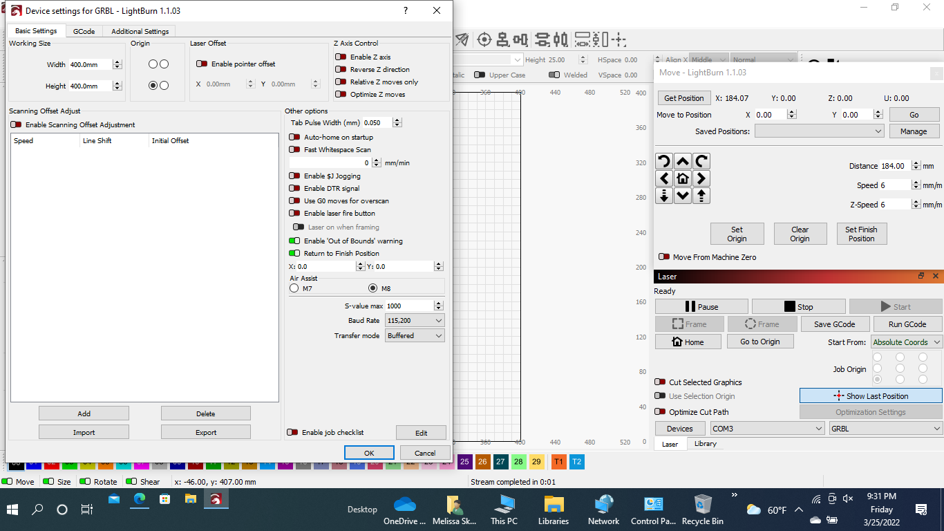 If I run the laser it works perfectly but if I frame or use the move buttons the laser freezes and coordinates do not match. Thanks for the suggestions.