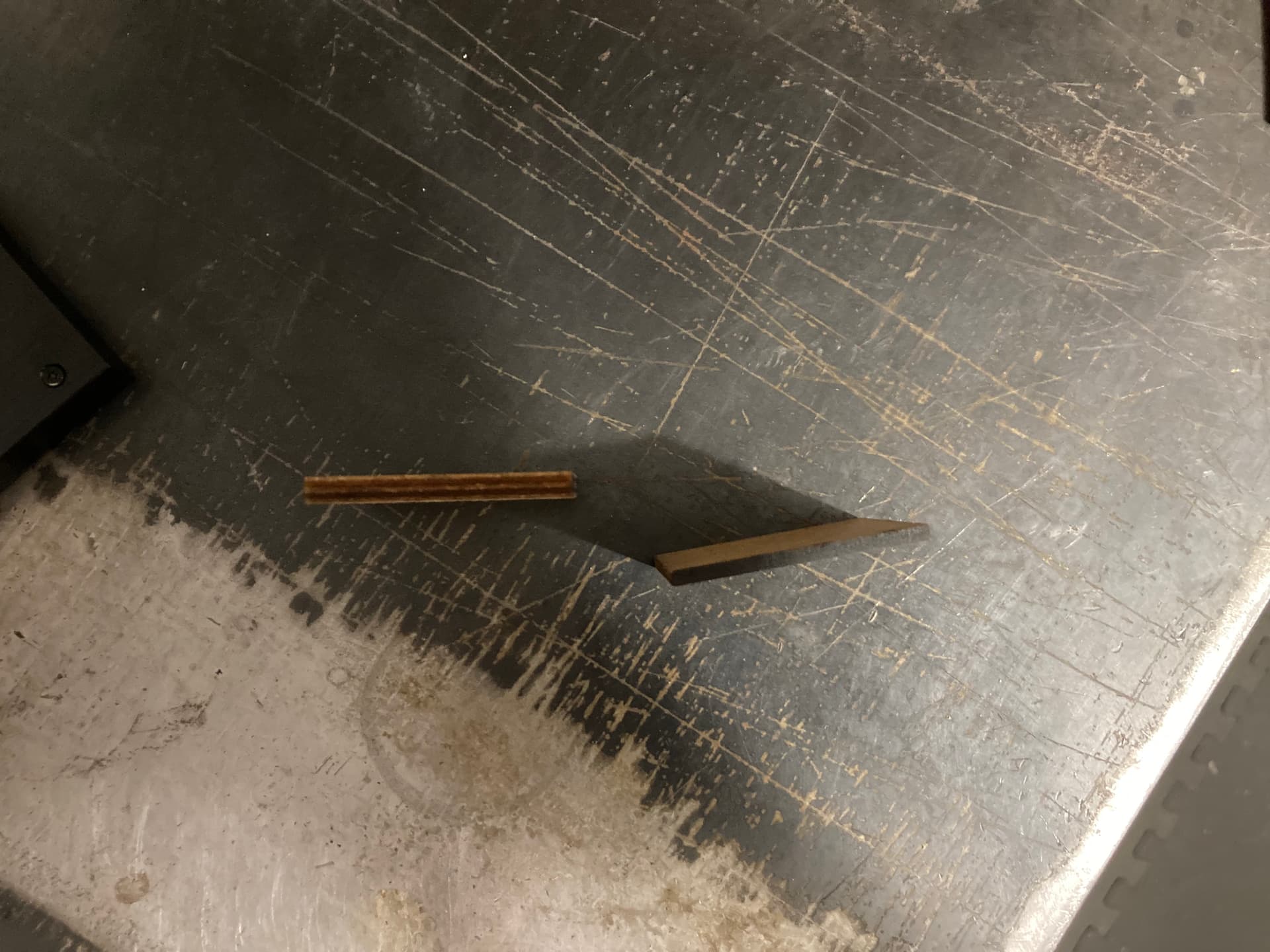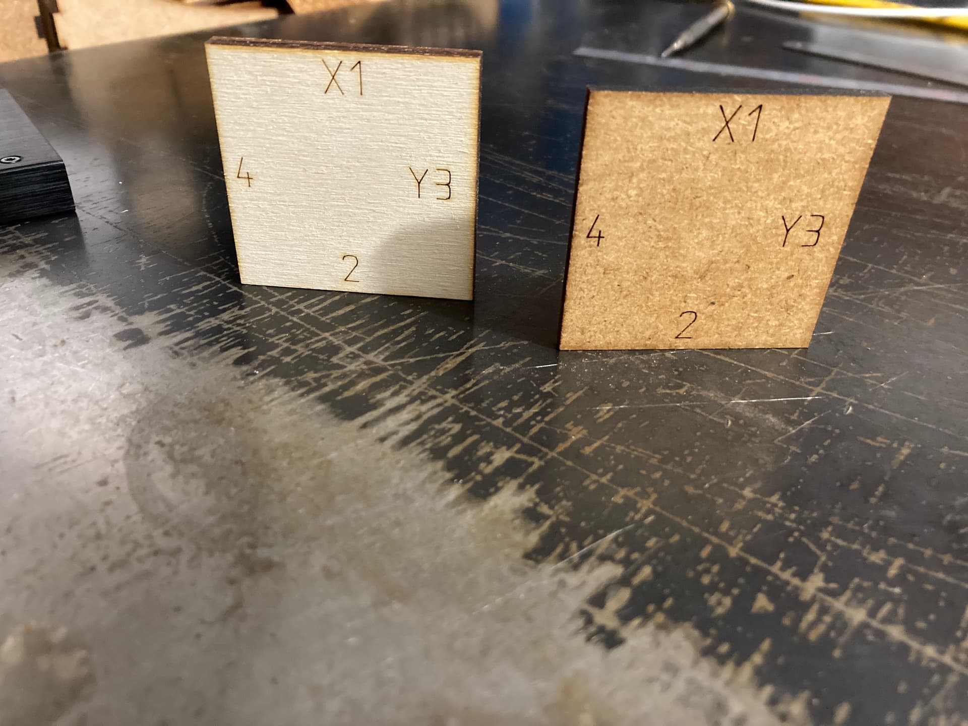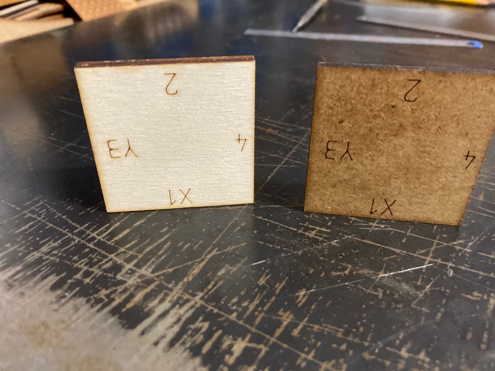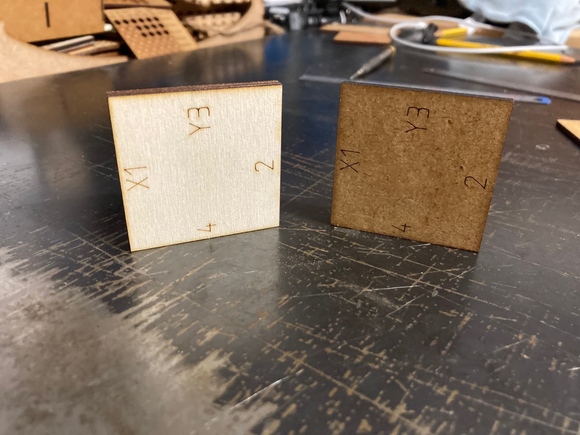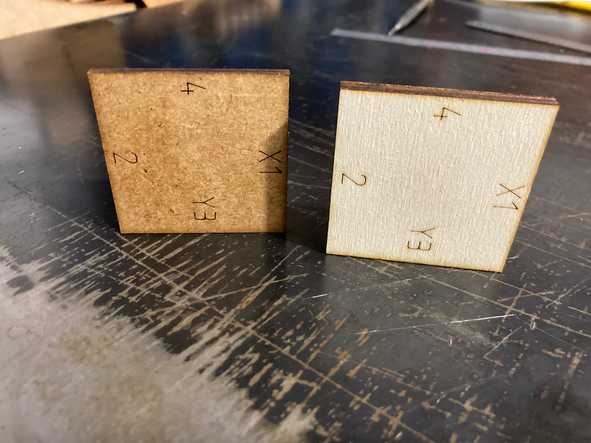The light material is 4.8mm poplar plywood and the dark is 3mm MDF.