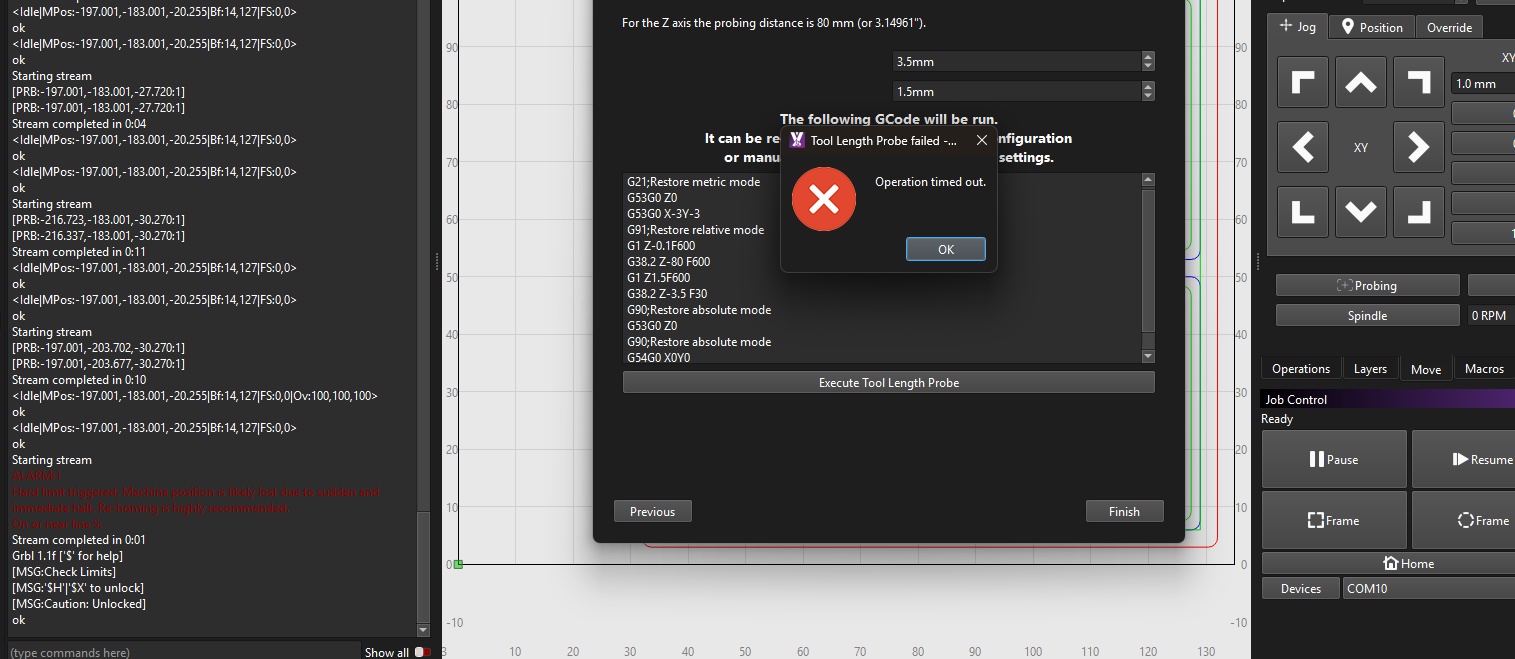I’m able to go through the Carbide puck probing process successfully on the Nomad³ on today’s nightly and get the same “Setting the WCO for the Z axis requires also probing the tool length.” dialog afterwards. When I run the Tool Length Probe, the tool is moved away from the puck and towards Zmin, triggers the Z axis endstop sensor and errors out with the “Hard limit triggered” message in the console, and with the “Operation Timed Out” dialog pictured immediately afterwards. I’ll write this up on our side tomorrow. Do you get the same message?