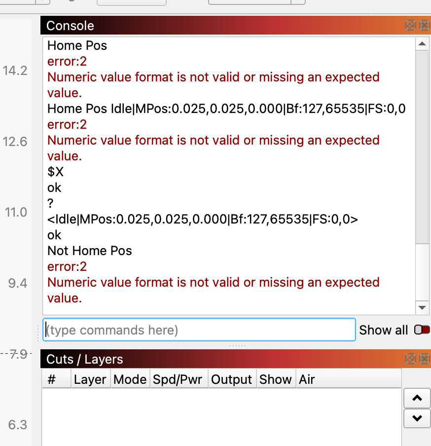 Then enter ? in the Console window. You should get a line that contains “MPos” in it. Copy and paste that line in a Reply as “Home Pos.”