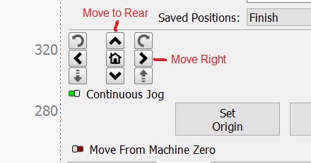 That leaves the Jog direction being backwards. Jog the laser module to about the center of the machine. Toggle the $3 parameter for Xaxis, then see if it Jogs left and right properly.