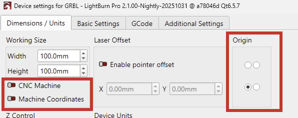 All your answers are good, Home is okay, Lightburn set, and reporting machine position 0,0 when Homed.