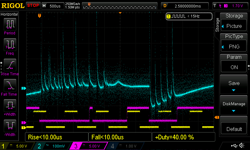 I’m looking back at your pwm control. I have to assume your source is a typical interface with power and pwm for control. I don’t have one, so I’ve made these inferences as a question of your scopes pwm trace.