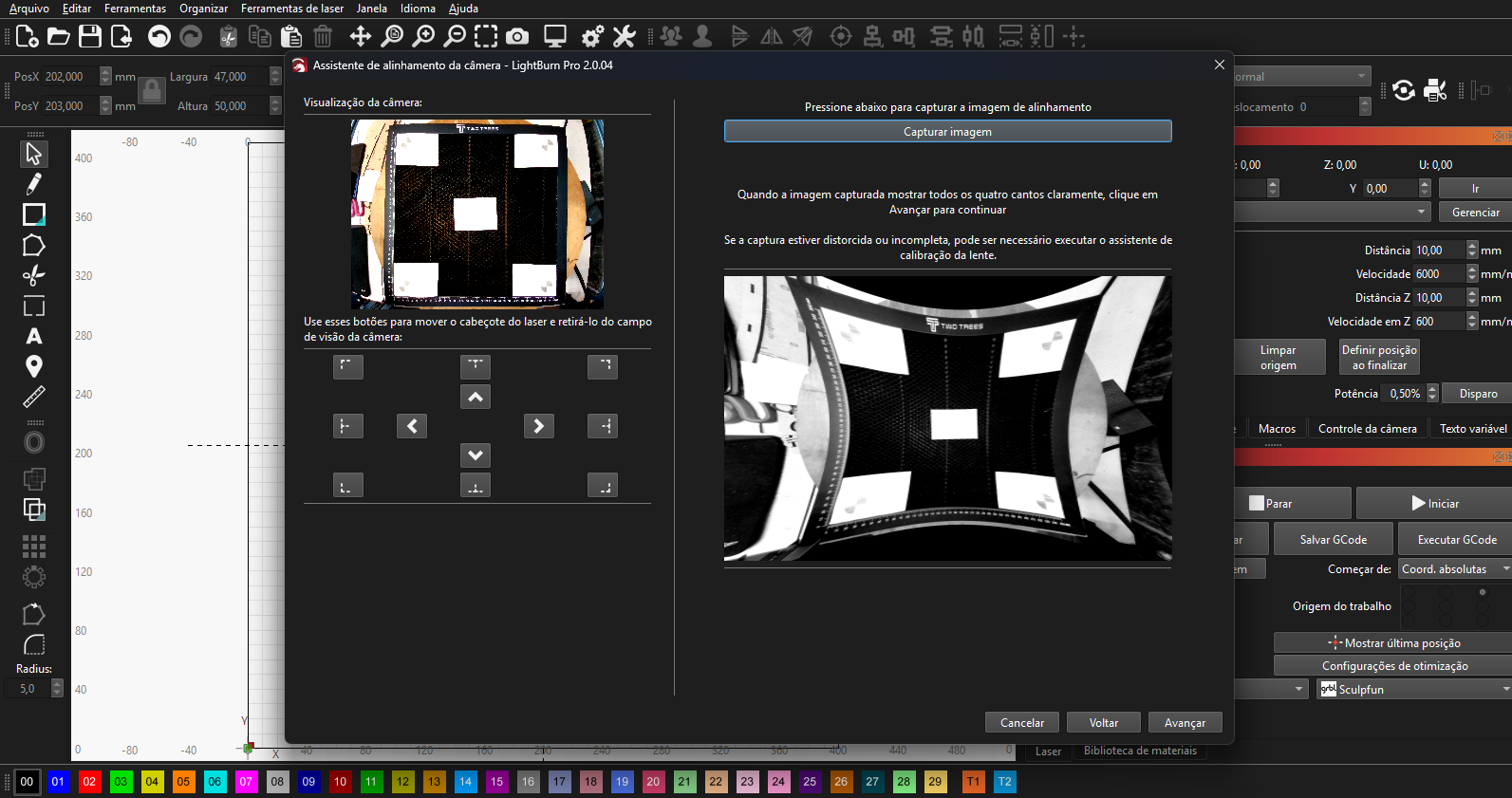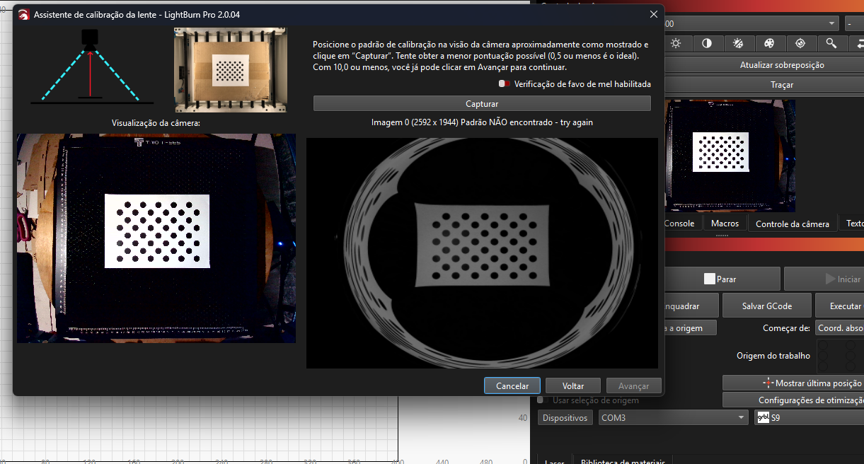 Segue print de como o software esta se comportando al tentar calibrar a câmera e ao tentar alinha.