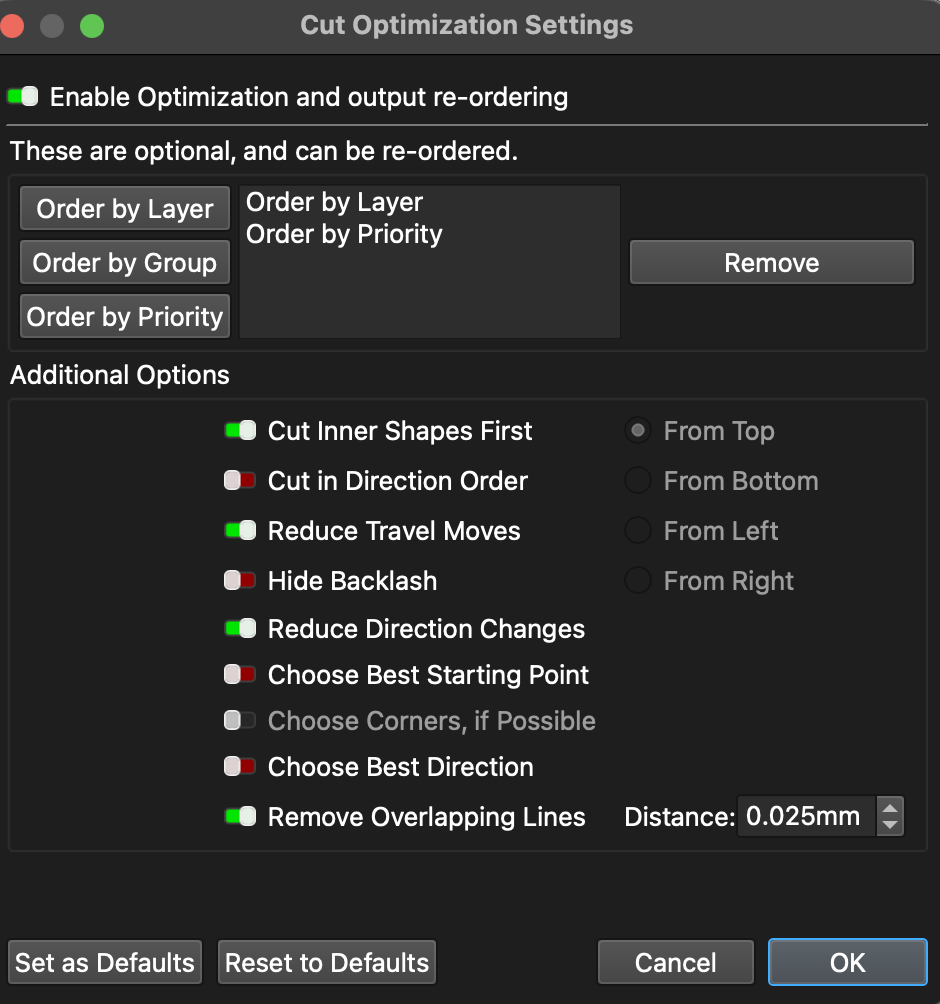 When running jobs on GRBL-based lasers, toolpath efficiency has a major impact on total job time, especially due to: