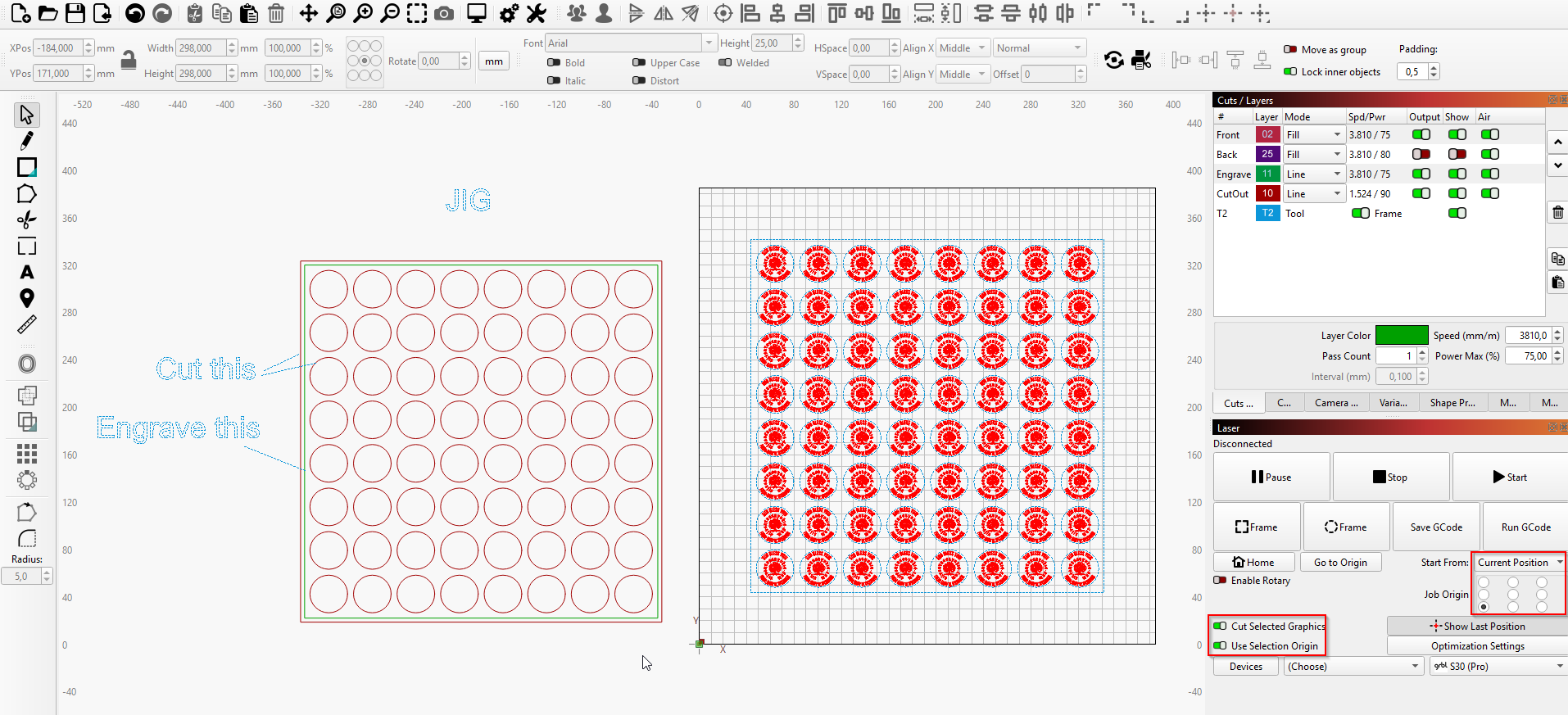 The next step is to select all engravings AND the square (on tool layer) around them. Set the options as depicted in the laser window. Then move the laser head to the lower left corner of the engraved square on your jig. Do a frame to check if the laser travels along the formerly engraved path. If so, start the job. Otherwise, reposition the head or the jig. You can even move the jig while the laser is travelling; this will save some time.
