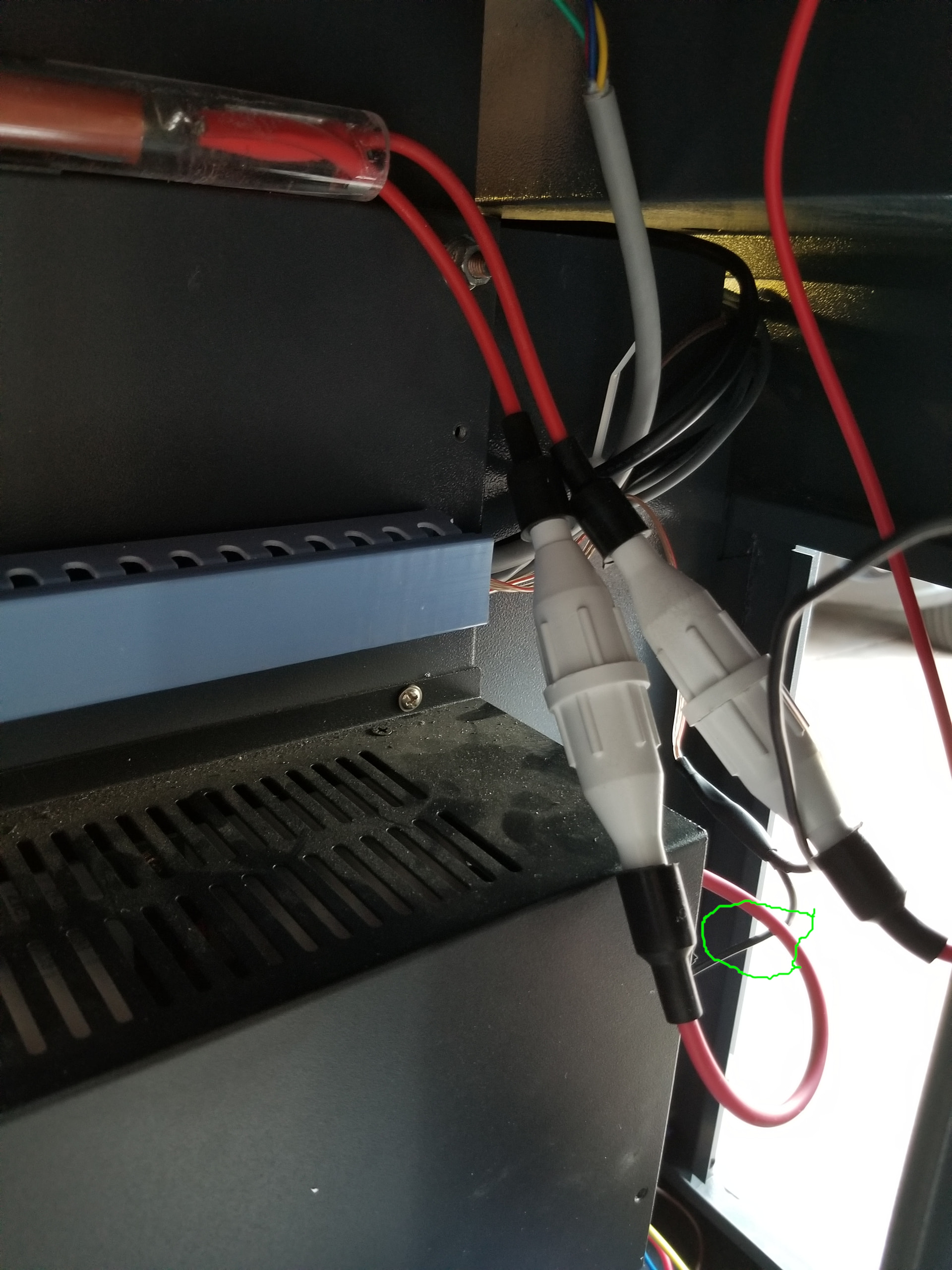 On my machine the ground return for the cathode is a small black wire, only the anode has a lot of insulation. The area circled in green shows the anode (red) and cathode (black) wires, only the anode has a thick coating of insulation. I get the white connectors from Amazon and use these exclusively for HV connections.