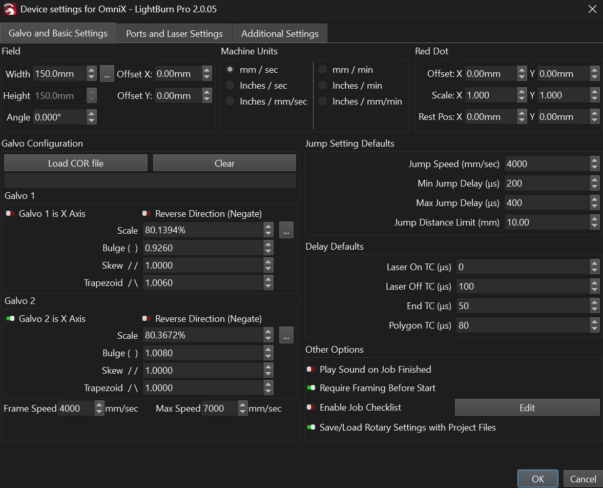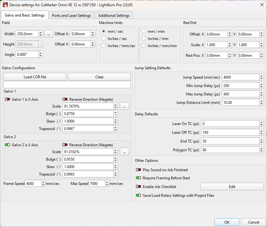 Also being a newbie with galvos, I had to struggle with the parameters for bulging, slant and trapezoid, which seemed to have sideeffects between themselves. But firstcof all it would be great to have help pop up with a graphics showing which change of parameters (lower / higher) has what effect. I had to make screenshots of your ancient (helpful, but not really up to date) video at youtube to be sure I chose the right direction …