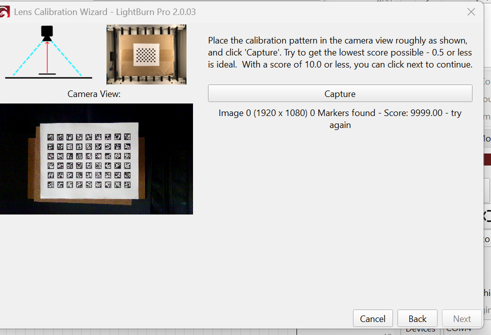 Okay. Good headway but still not there. Got a good lens calibration of 0.43 and hit NEXT. Then nothing happens. I tried numerous times and NEXT gets grayed out while CANCEL, BACK and CAPTURE buttons all remain active. But it stays on the lens calibration screen. I’ve even left it for several minutes with no change.