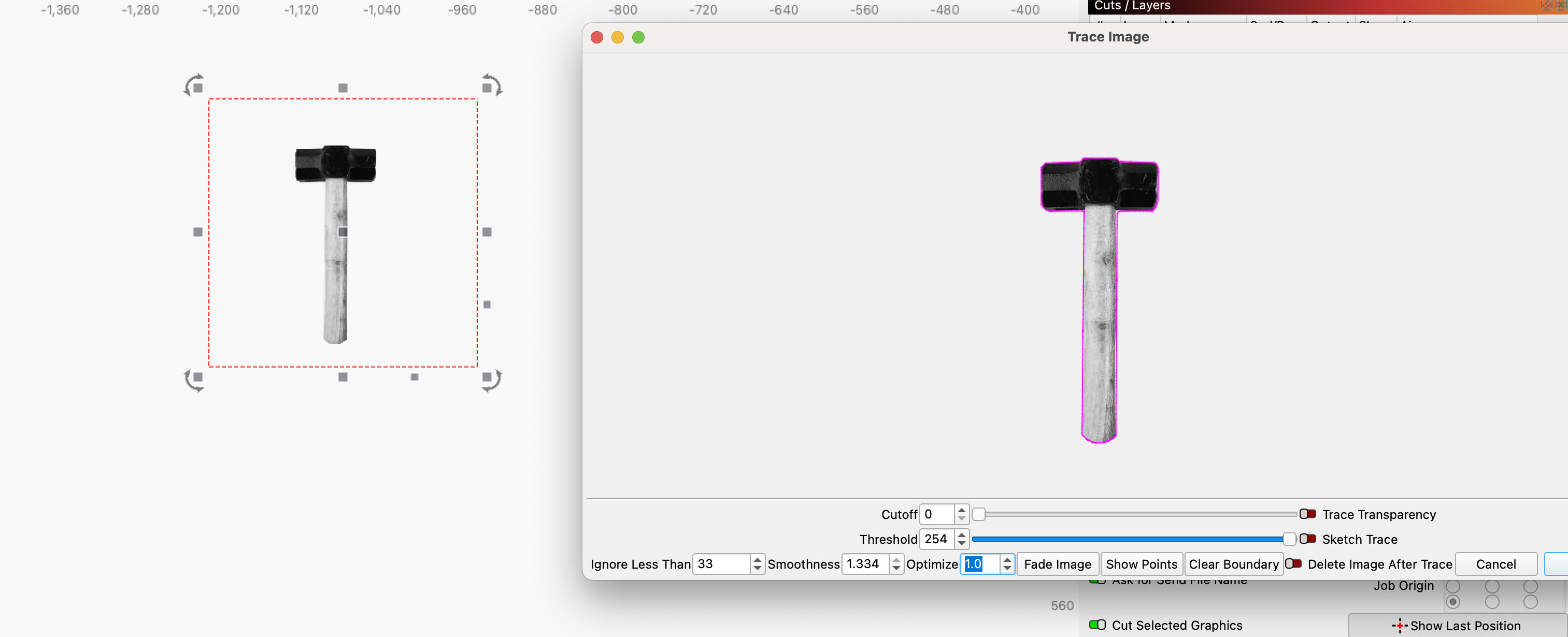 However, you must first trace your image to get the outer edge of your tool. I achieve the best result for this when I process the image in a way that makes it easier to trace. Then you must determine, with the offset function, how much tolerance you want around your tools.