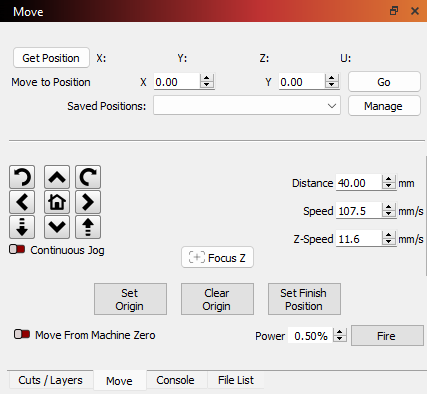 A Macro is a segment of code that runs when you click on the button. In this case, it would be some GCode that tells the laser where to move to. If you have more than one machine, the Macro follows the selected Device, meaning each machine will have its own set of Macros.