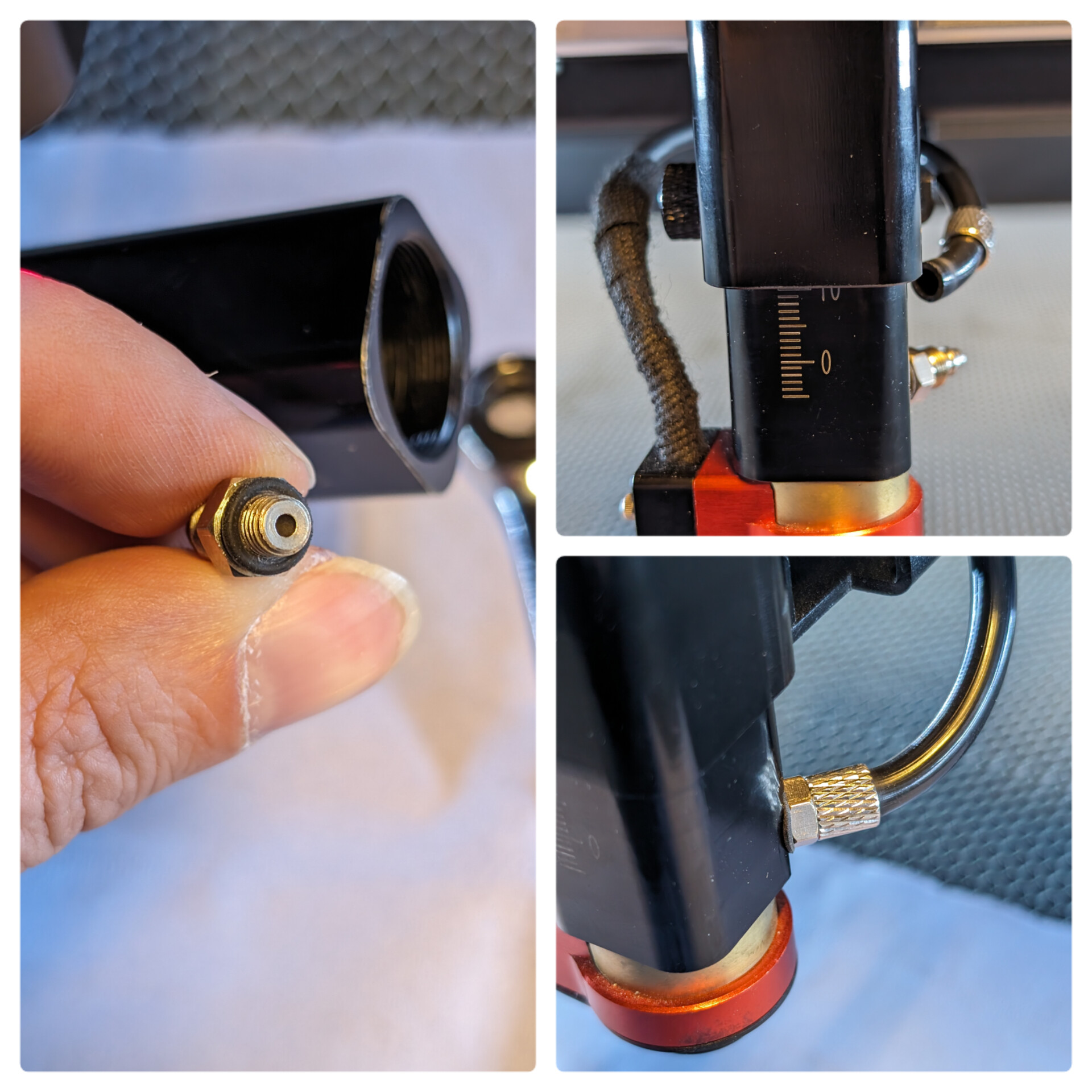 On the 130w machine, the connection from air hose to nozzle inlet has a 2mm hole (more or less) which doesn’t seem large enough of a diameter to let any decent amount of airflow into the nozzle chamber - the 80w has around 3mm, including through the 90deg elbow inlet connection. I also query whether the concave cone shape is better or worse when compared to the convex shape on the 80w, which is the machine that outperforms…