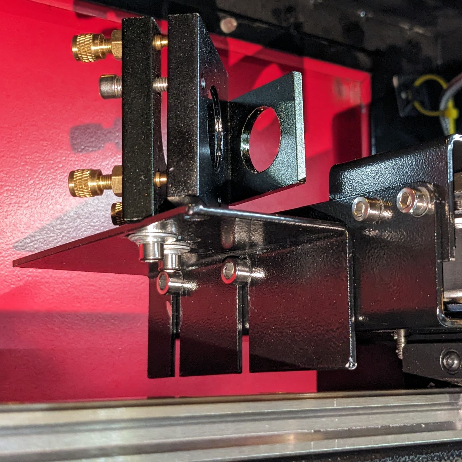 I have set up the machine so that the laser beam goes straight from the tube via mirror 1 vertically up to mirror 2, mirror 2 to mirror 3 and mirror 3 to mirror 4 (yep, nova elite has 4 mirrors). My problem is that the beam does not hit the center of the last mirror. The nova has fixed mirrors and head so I can’t adjust that.