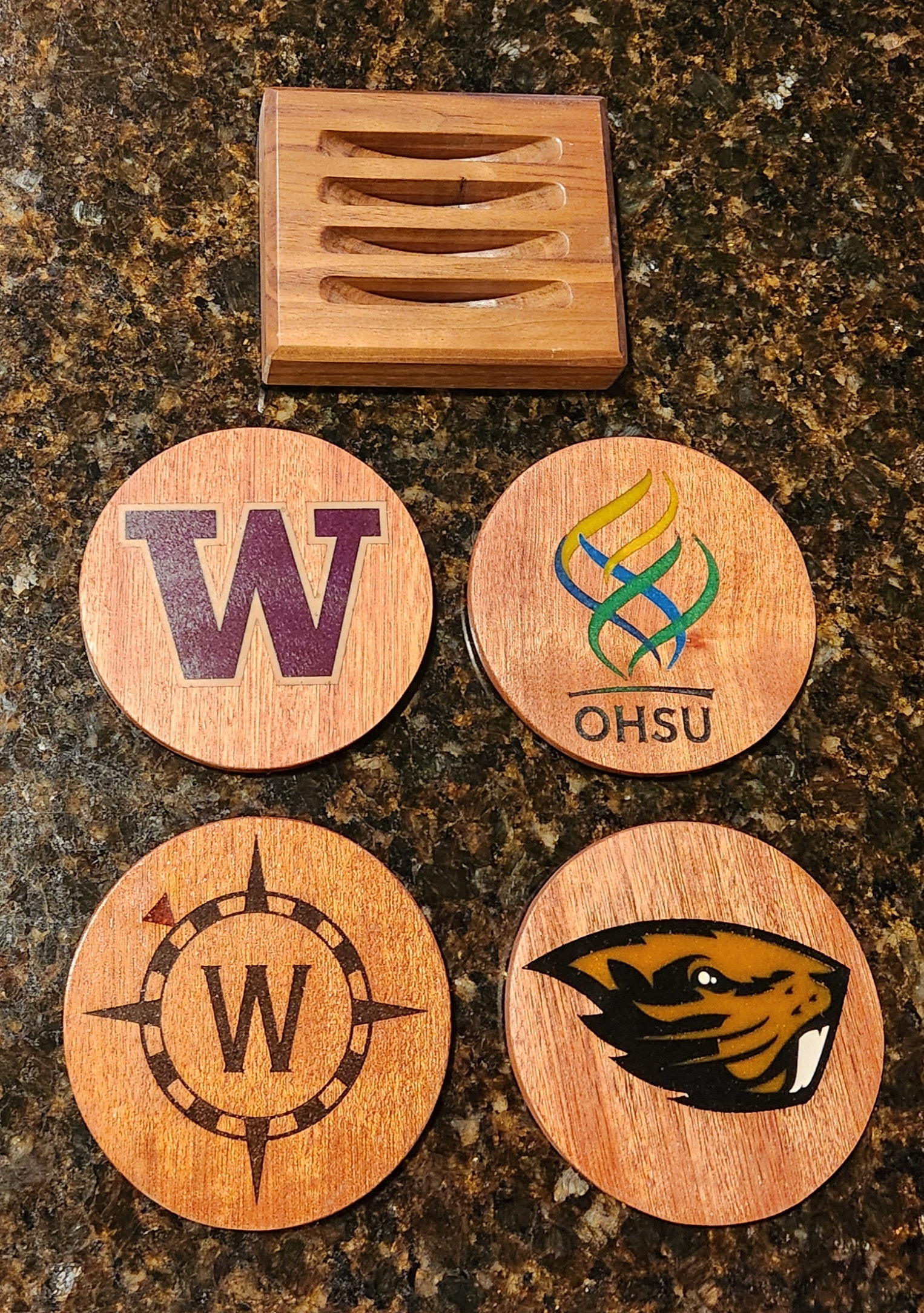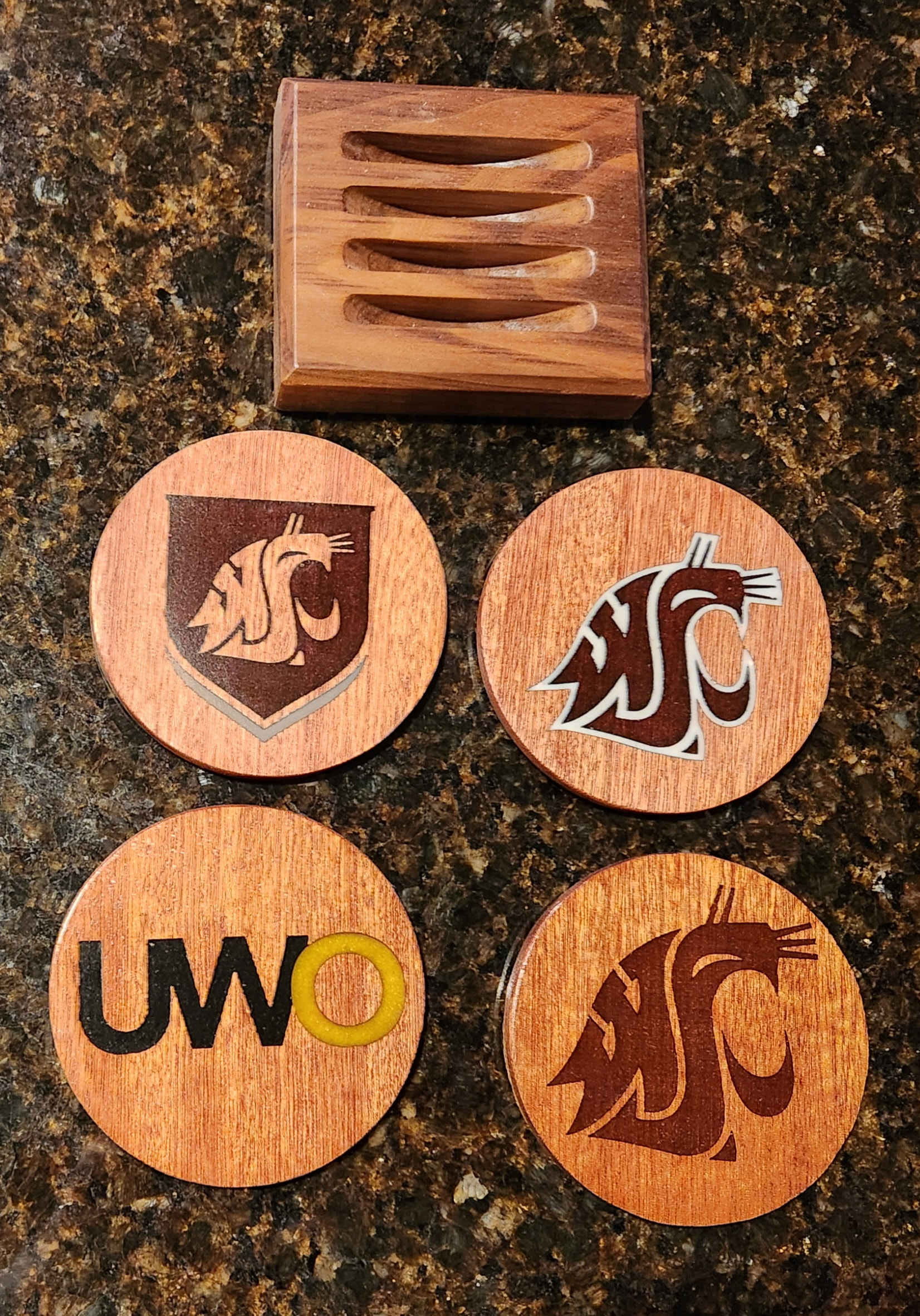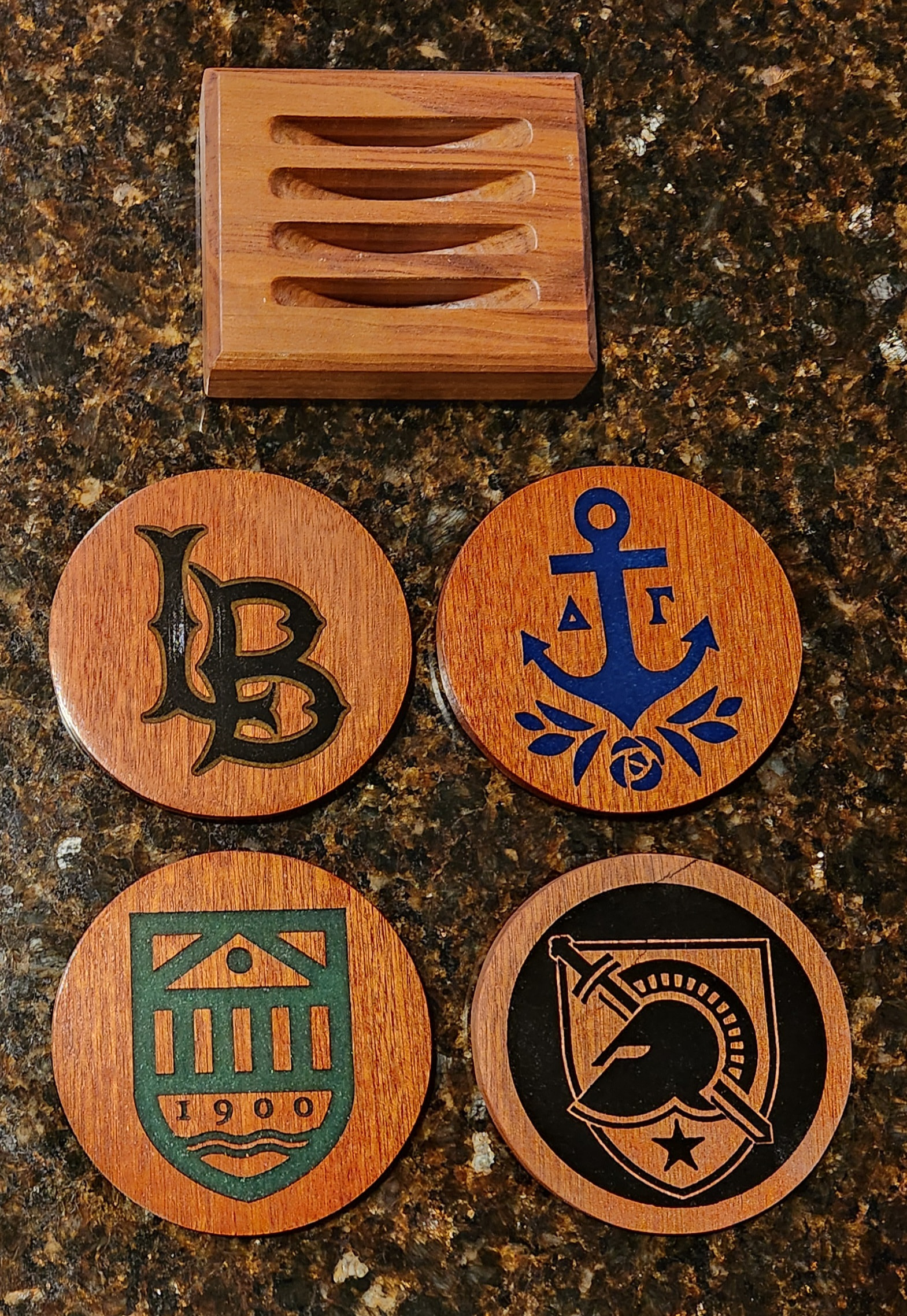 Coasters were laser engraved on Sapele discs, then colored with epoxy resin and backed with cork. Holders are Black Walnut, cut with a CNC.