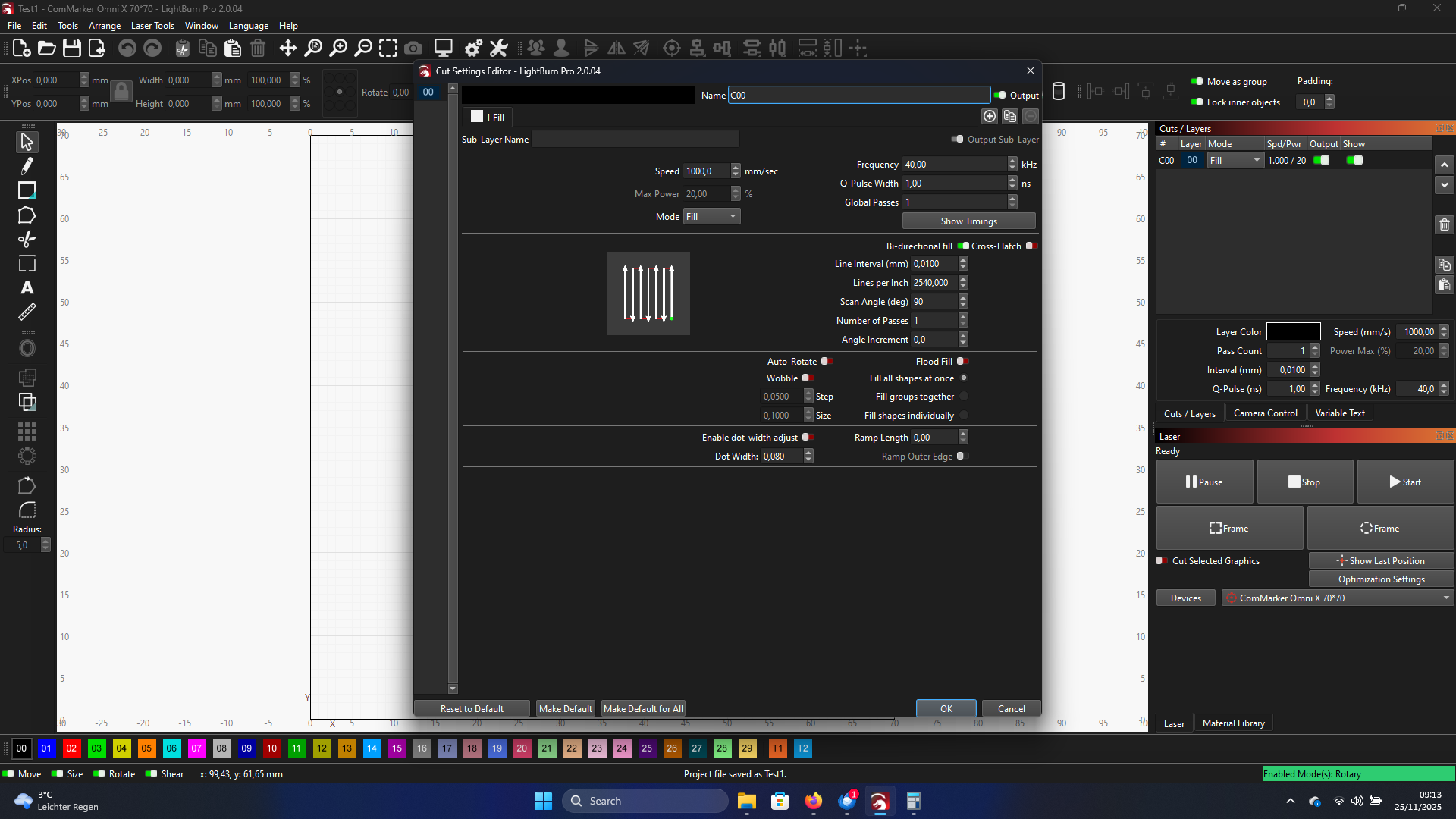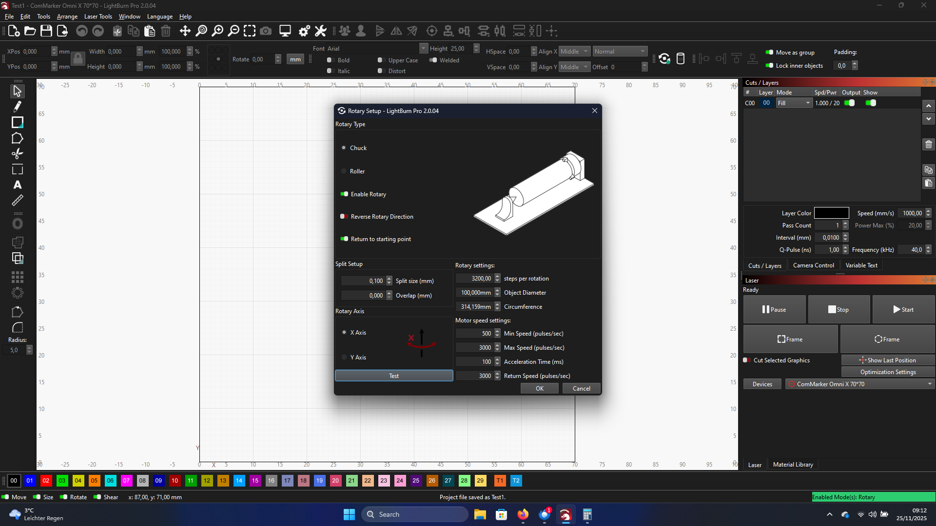 I received my Omni X in early November and managed to get it working with LightBurn (only had time for a quick test). Unfortunately, the rotary behaves quite strangely. The 3200 steps per rotation value provided by Commarker seems correct, as the axis travels exactly 360° when running the test.