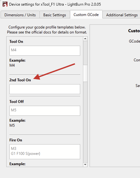 Then, in the Device Settings, entered their Start Gcode, End GCode, and 2nd Tool On