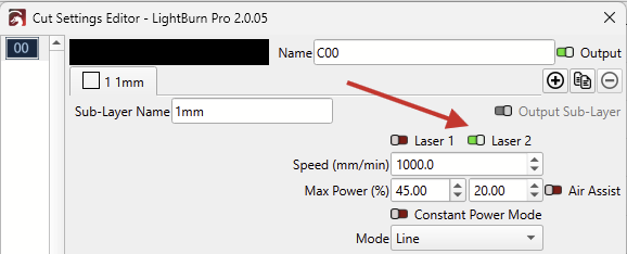 If there is any code in the “2nd Tool On” field, it will unlock the “Laser 2” option in the Cut Settings: