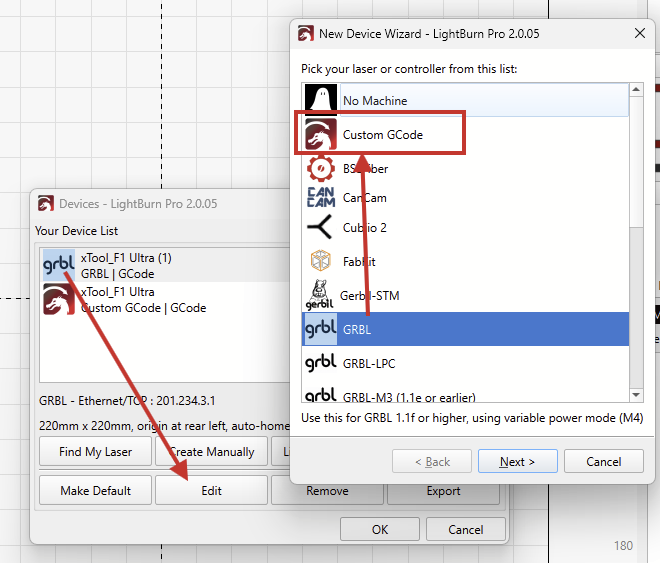 ..I imported xTool’s .lbdev device profile and changed the device type from “GRBL” to Custom GCode: