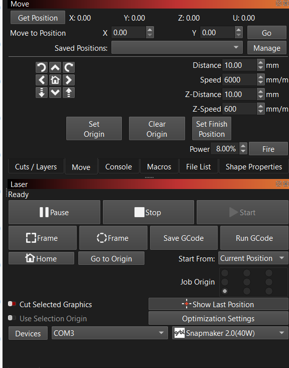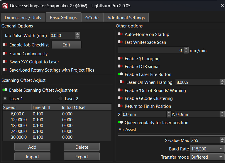 I have been struggling with getting Lightburn version 2.0.05 with the Snapmaker 2.0 A350 using 40W laser, FW version V1.20.3_20240716 (all show as current) to work properly. I am able to connect but there are some issues with positioning. I noticed that when connecting that the console reports two errors: