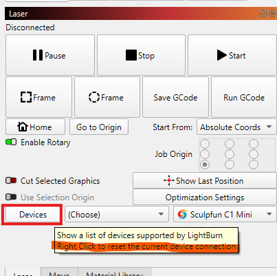 Let’s try a right click on the Devices button in the “Laser” window to reset the current connection: