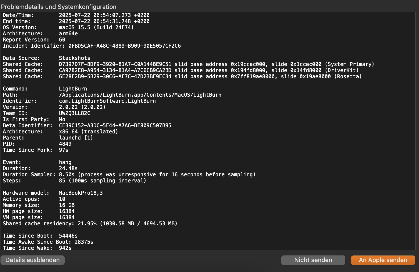 I found out that I can avoid the lightburn crash by unplugging the USB Cable quickly whenever it starts to freeze. At this point I am pretty sure that it is a lightburn issue and not a laser hardware or configuration issue.