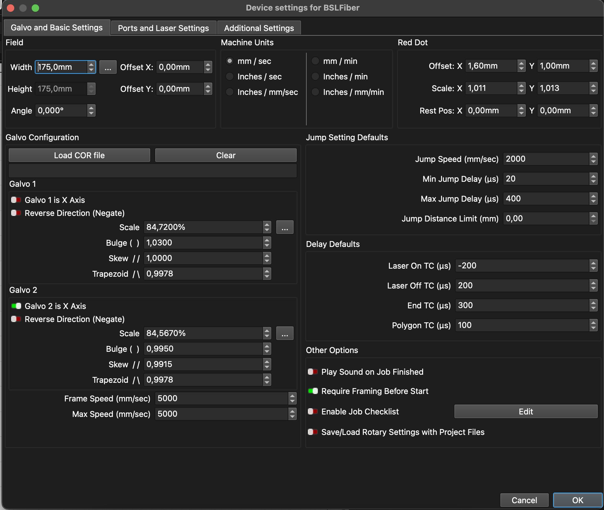 Your device settings differ from the defaults, which indicates that you imported the correct config file while you added the galvo!