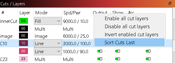 I am routinely annoyed by the cut order constantly changing automatically. I often set up a job in the right order, then make a few tweaks then hit run and find that my cut layer (which should be and was last) is now first and it starts cutting before engraving.