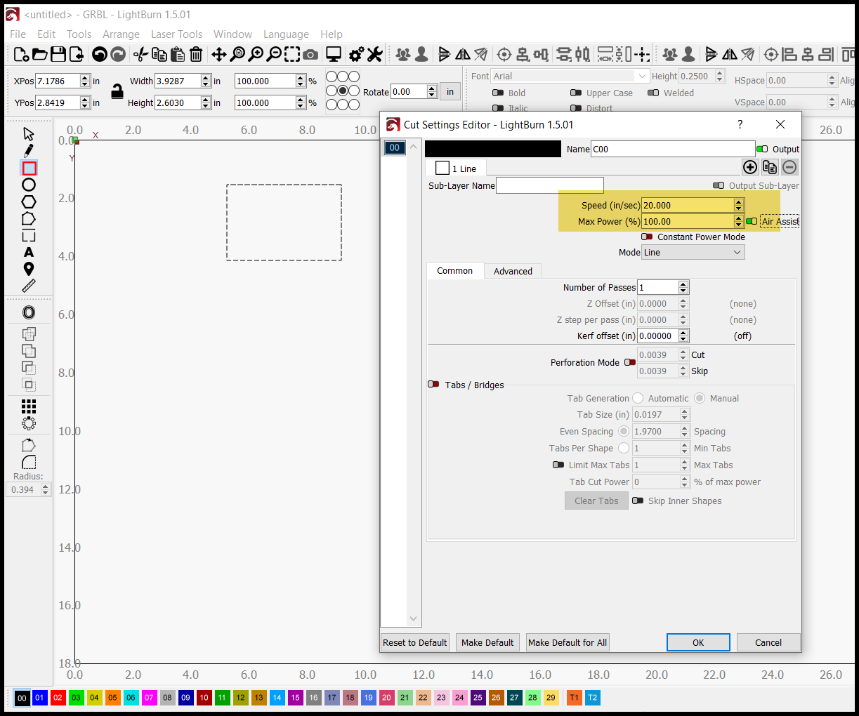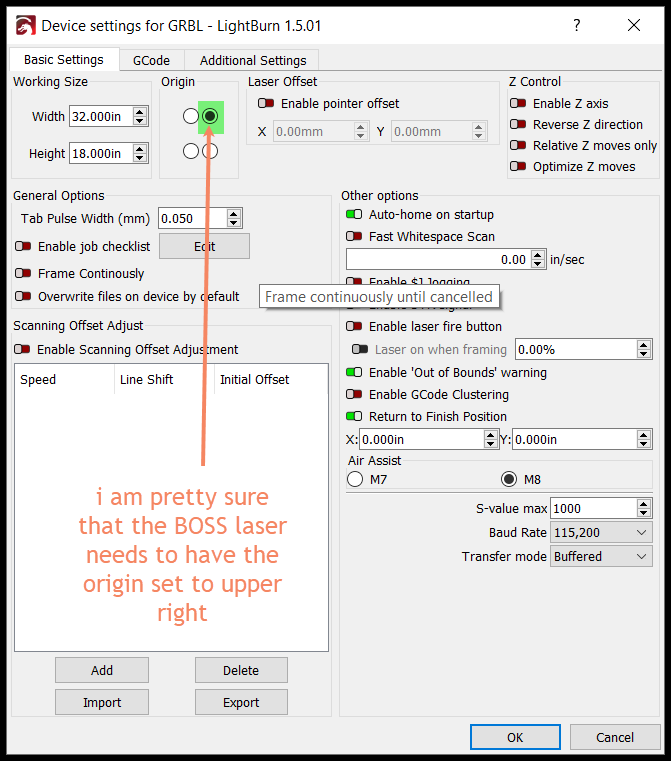 Now to my problem, I added my Boss Laser to the Lightburn program and I when I take an image on Lightburn (DXF File) and attempt to cut it out, first it mirrors my image on my laser and when I set my speed at 20 and my power at 100, it runs a lot faster on my laser and ends up scoring instead of cutting out the image. Has anyone else had this issue and can anyone give me any advice on how to fix both issues?