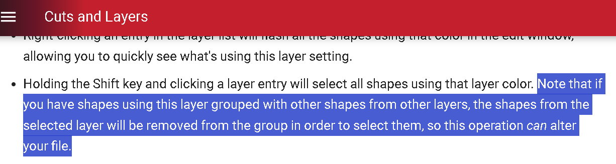 I’ve noticed another part of the pattern of when it changes the layer order. If I change a shape to a different color that’s already present in the current file, it won’t change the cut order. However, if I change the shape to a color that isn’t currently in the file (even if it was before and was set to a certain layer position) it will always be set to be the last layer. This is very annoying. I often temporarily change the color of shapes in order to make it easier to hide them out of the way to select other shapes near them. This behavior makes it so my cut order gets messed up every time I do this. Could we just have LB store the relative cut order of all the colors in the current document? That way even if that color goes away (no more shapes on that layer) then comes back (some shape gets set to it again), it will retain its relative position in the cut order?