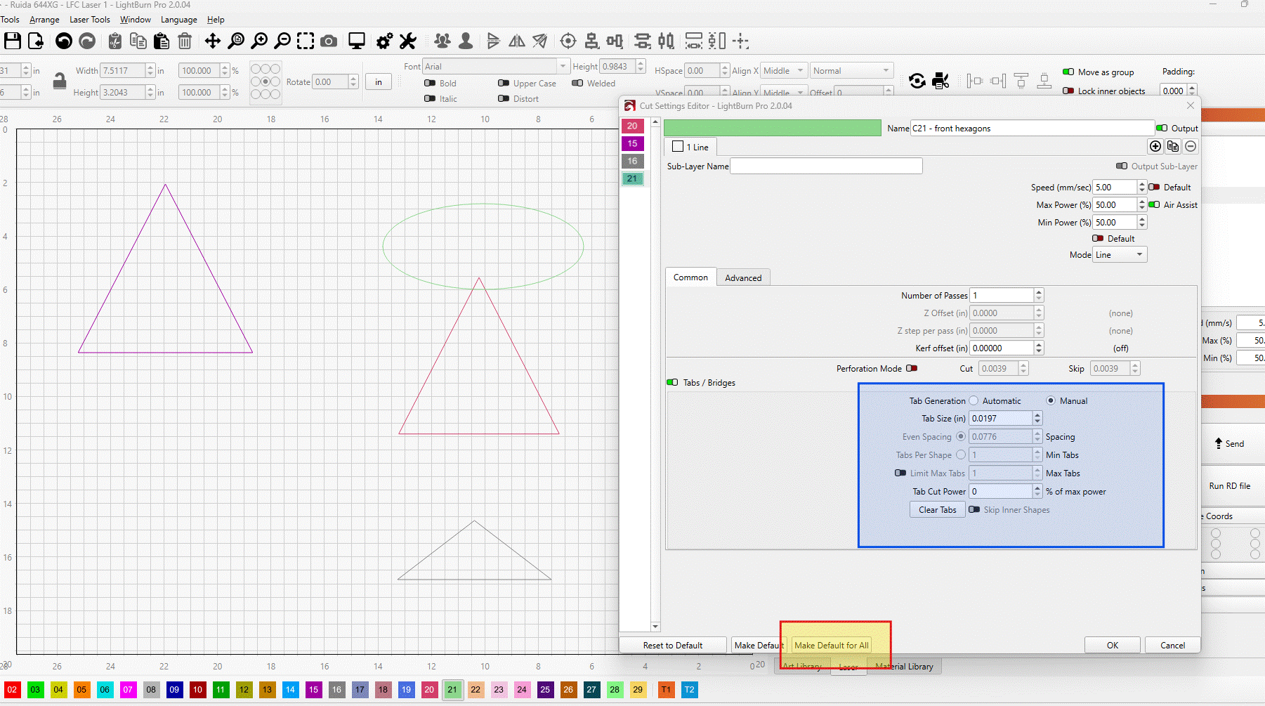 I’ve tried using the highlighted button in the included image and it seems like it wants to give me the option to “make this the default for all layers on this device?”. But when I create a new layer it defaults back to tab size .0197, manual and so forth.