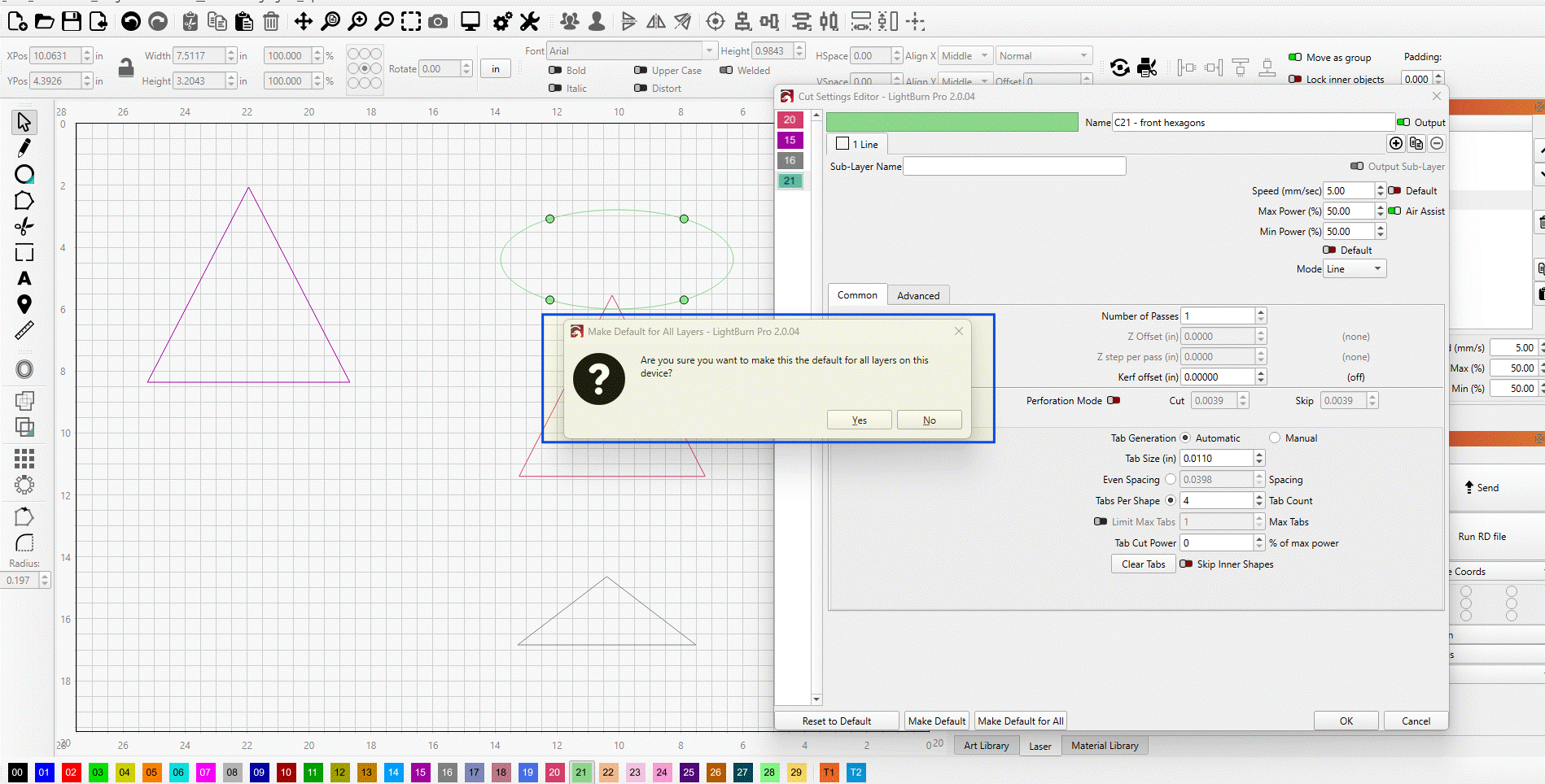 I generally use the black layer for engravings, the blue layer for text, and the red layer for cuts, with the settings pulled from the library for whatever material I’m using. Easy to see, easy to remember, and easy to change!