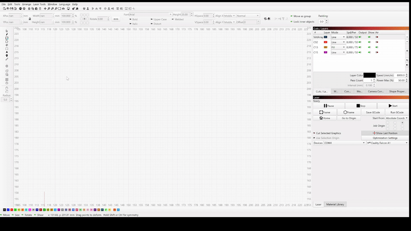 Hi, I’ve just run in to this problem out of nowhere where using deform selection (16 point) is causing lines to disappear, I suspect it is related to the X and Y position and dimensions changing to nan but do not know why this is happening and it was not occurring previously (an hour or so ago) with no changes to settings or layers. It happened whilst I was working on a file and now happens even when I open a new file or close and reopen the software to a blank page. Running on windows 11, Lightburn version 2.0.05, I have tried reinstalling and the issue persists.