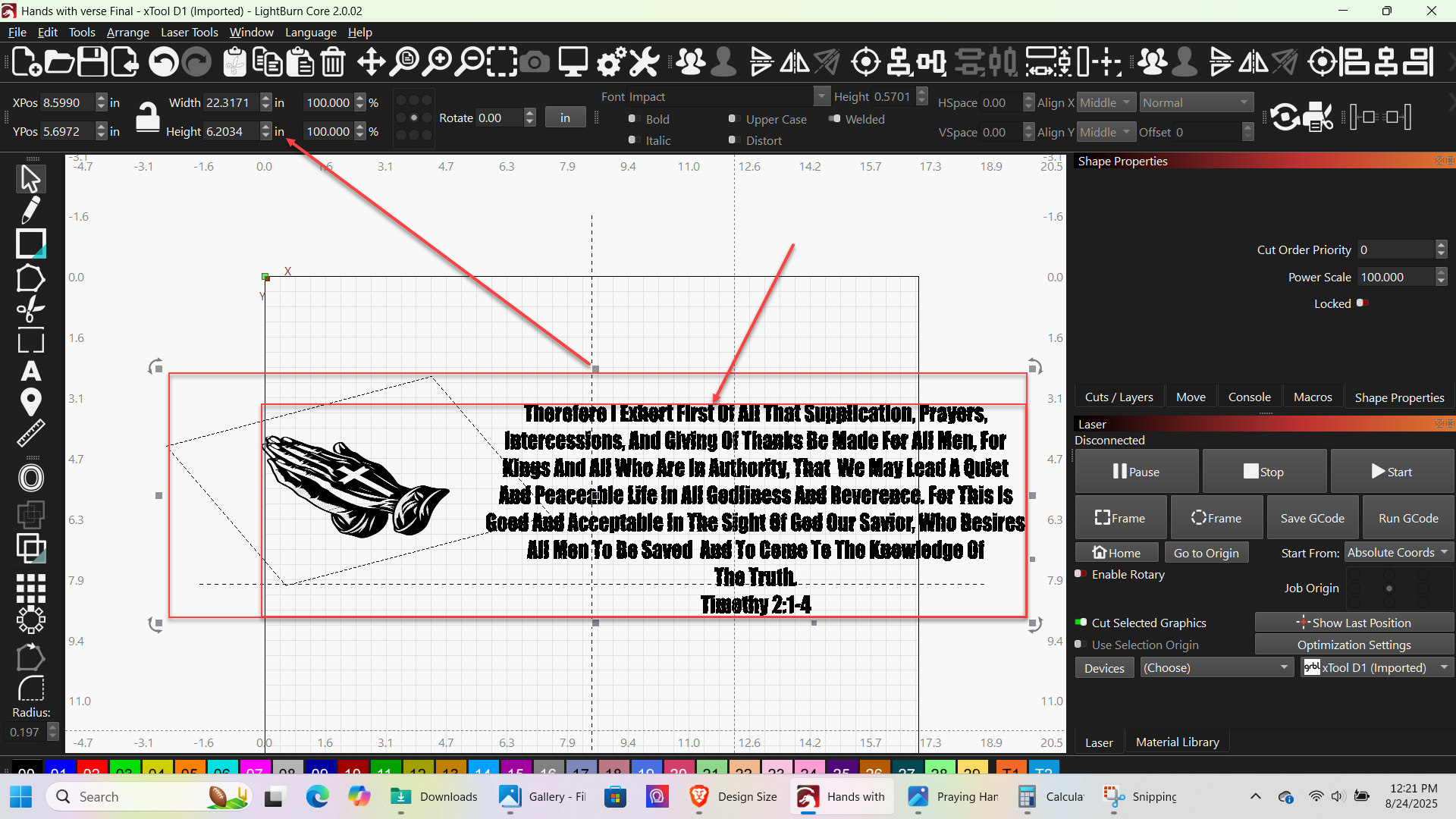 I did the design on my other laptop like before the transfer it to flash drive then to my laptop by the laser, just like before. 7 9/16 inches wide by 5 3/16 high if you need any other data from the settings or can tell me how to paste the first one I sent you today the right way, let me know? I will leave in a few hours then be back tomorrow. Thank you so much.