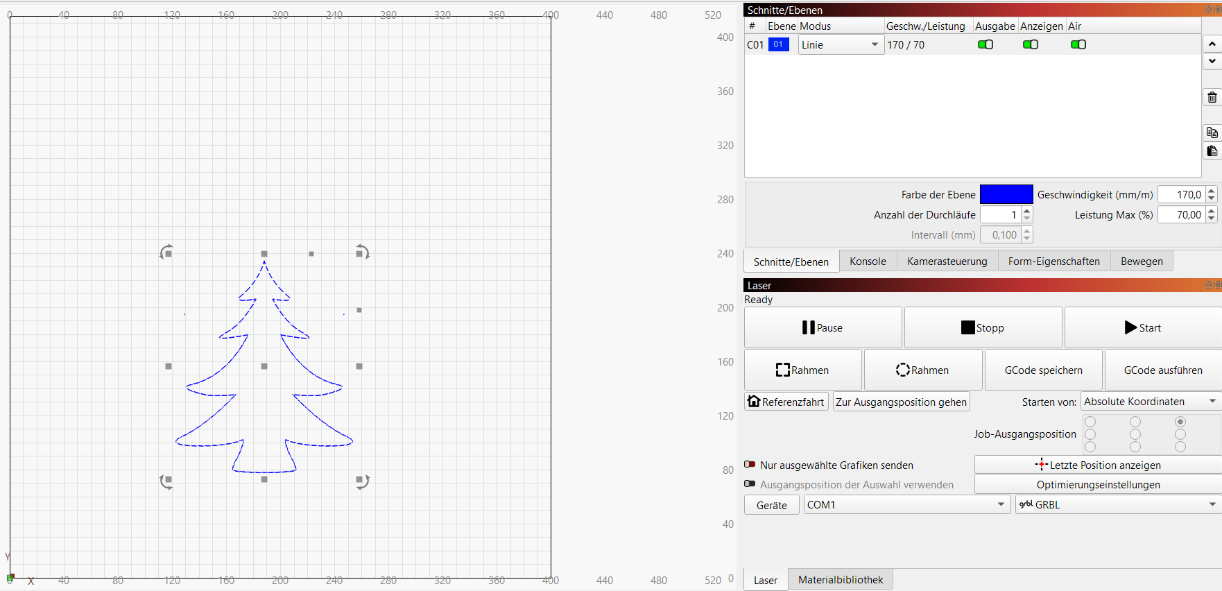 Ich habe eine Datei (png), die nur die Hälfte eines Engels darstellt. Mann soll den Rest spiegeln. Ich habe das Bild mit der Hälfte in ein svg umgewandelt, dann in Lightburn (Vers 2.05) importiert, dort das Vektorbild dupliziert, auseinander gezogen, die linke Seite vertikal gespiegelt und anschließend mit den Pfeiltasten nach Sicht unter Berücksichtigung der y Werte zusammengeschoben. Hat auch alles super geklappt. Gruppiert und ab in den Creality Laser. Laser gestartet. Er fängt oben an und fährt die rechte Seite herunter bis er an der untersten Stelle angekommen ist. Statt nun weiter nach links oben zu fahren, fährt er die rechte Seite erneut ab - von unten nach oben! Da er aber beim ersten Mal schon durchs Holz war, führt das schnell zu einem Brand und der Laser piepst wahnsinnig laut - Brandmeldung Alarm. Ich habe überprüft, ob die Linien doppelt sind. Sind sie aber nicht!!!