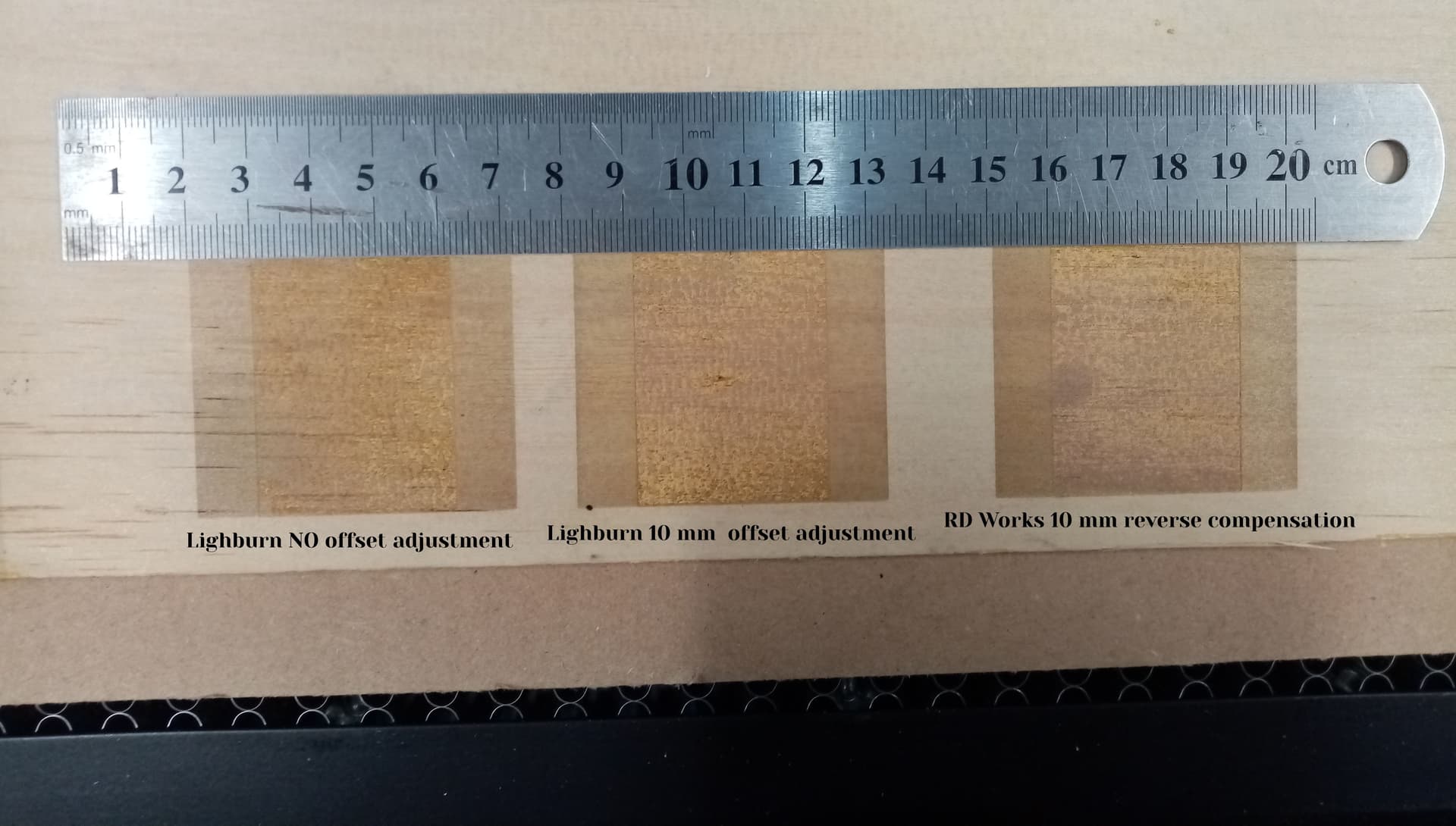 Then did with no offset compensation, with 10 mm offset compensation in Lightburn and with 10 mm offset compensation in RD Works. The compensation settings changed nothing, as the offset remained the same at 10 mm.