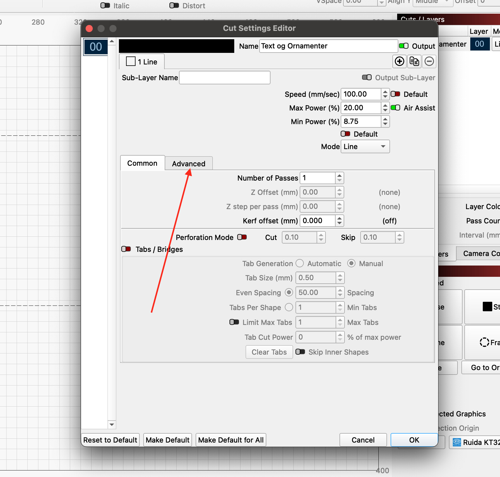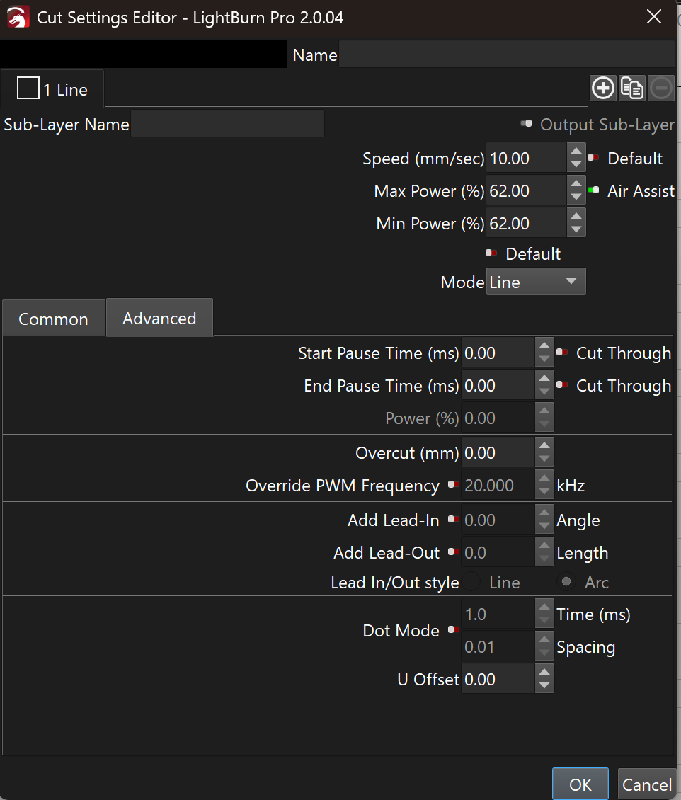 For this red acrylic, im using 10mm/s and 60% power. This cuts through fine but the edge is far from smooth.