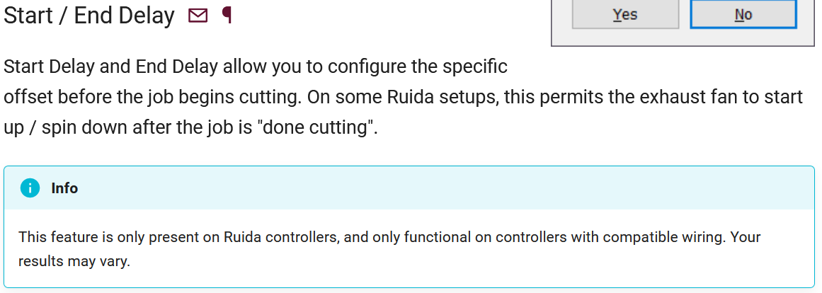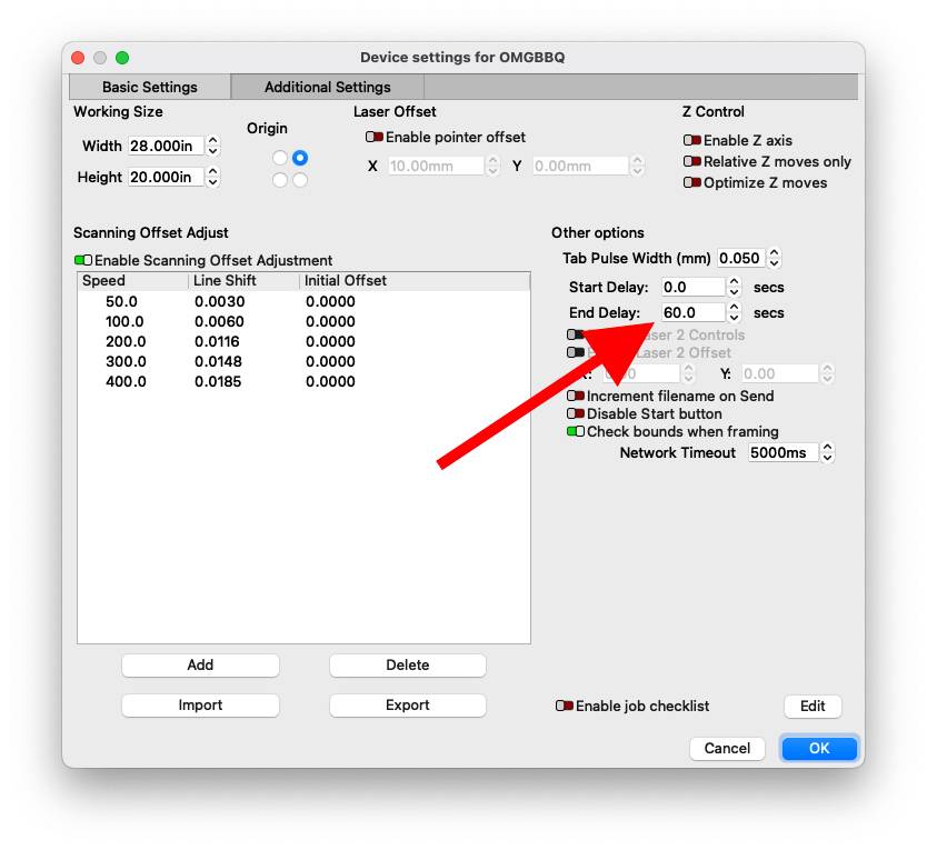I noticed the end delay can be set to 60secs, which is great, however, when timing it, it waits for about 17 seconds then finishes the cut. I can’t set it longer than 60secs, so its always waiting about 17 seconds afterwards. I’d like to set it much longer, about 1:30/2 minutes, so that I’m sure the smoke is cleared out of the laser each time.